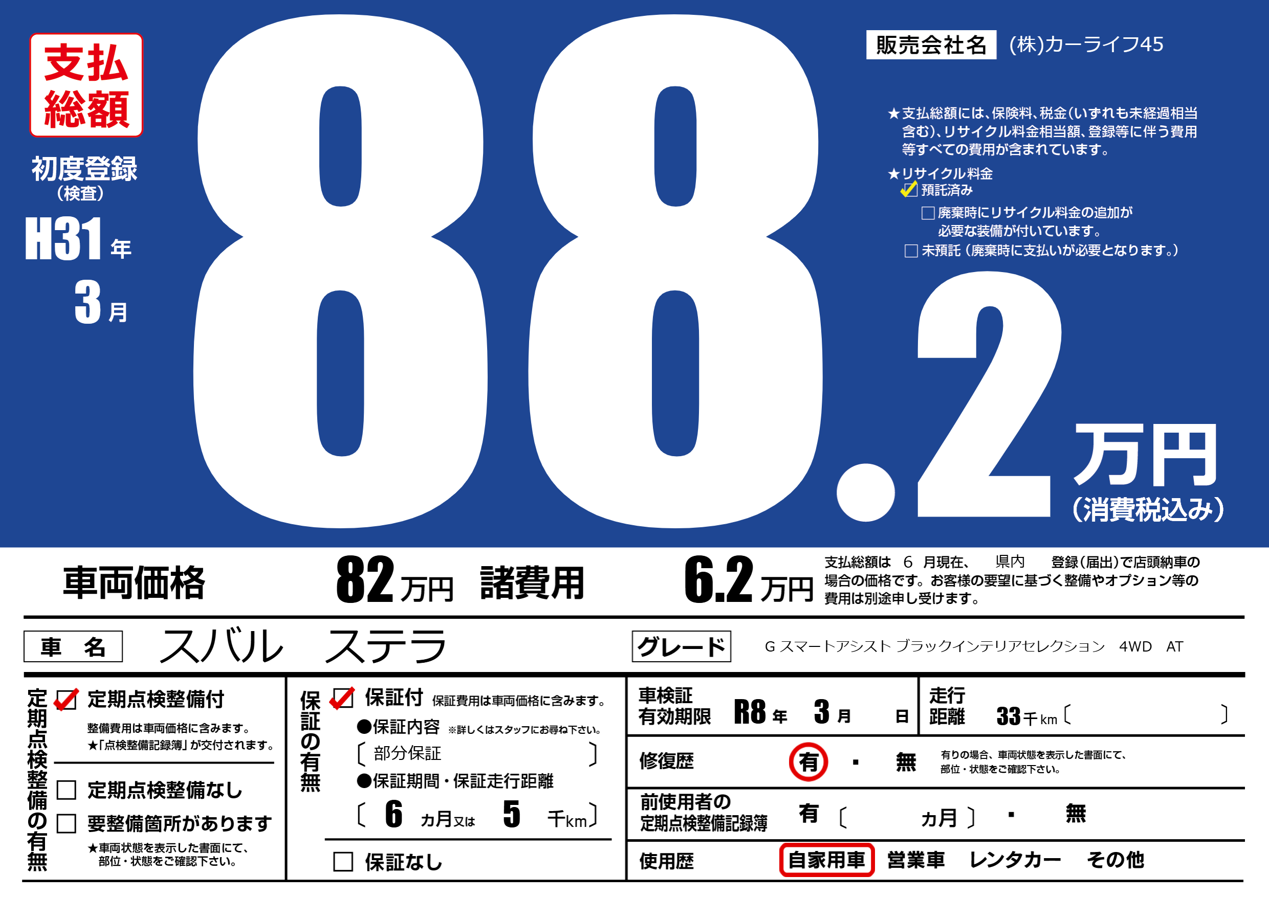 | 車名 | スバル ステラ | グレード ミッション 排気量 |