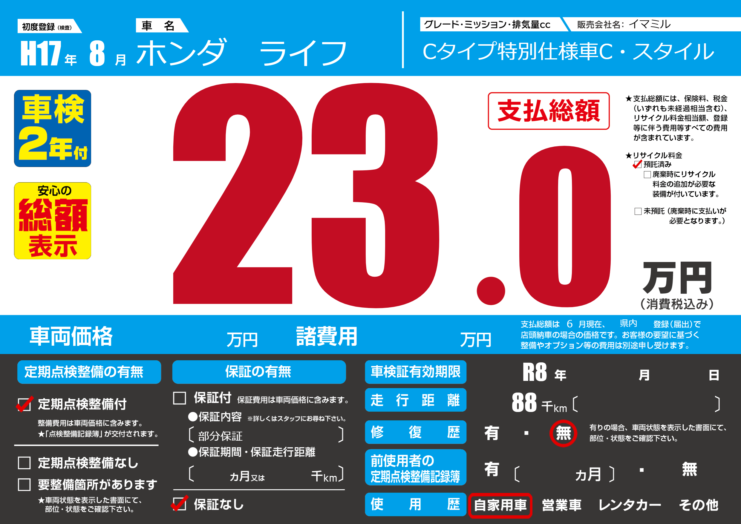 | 走行キロ | 8.8万km | 初年度登録 | H17年8月 |