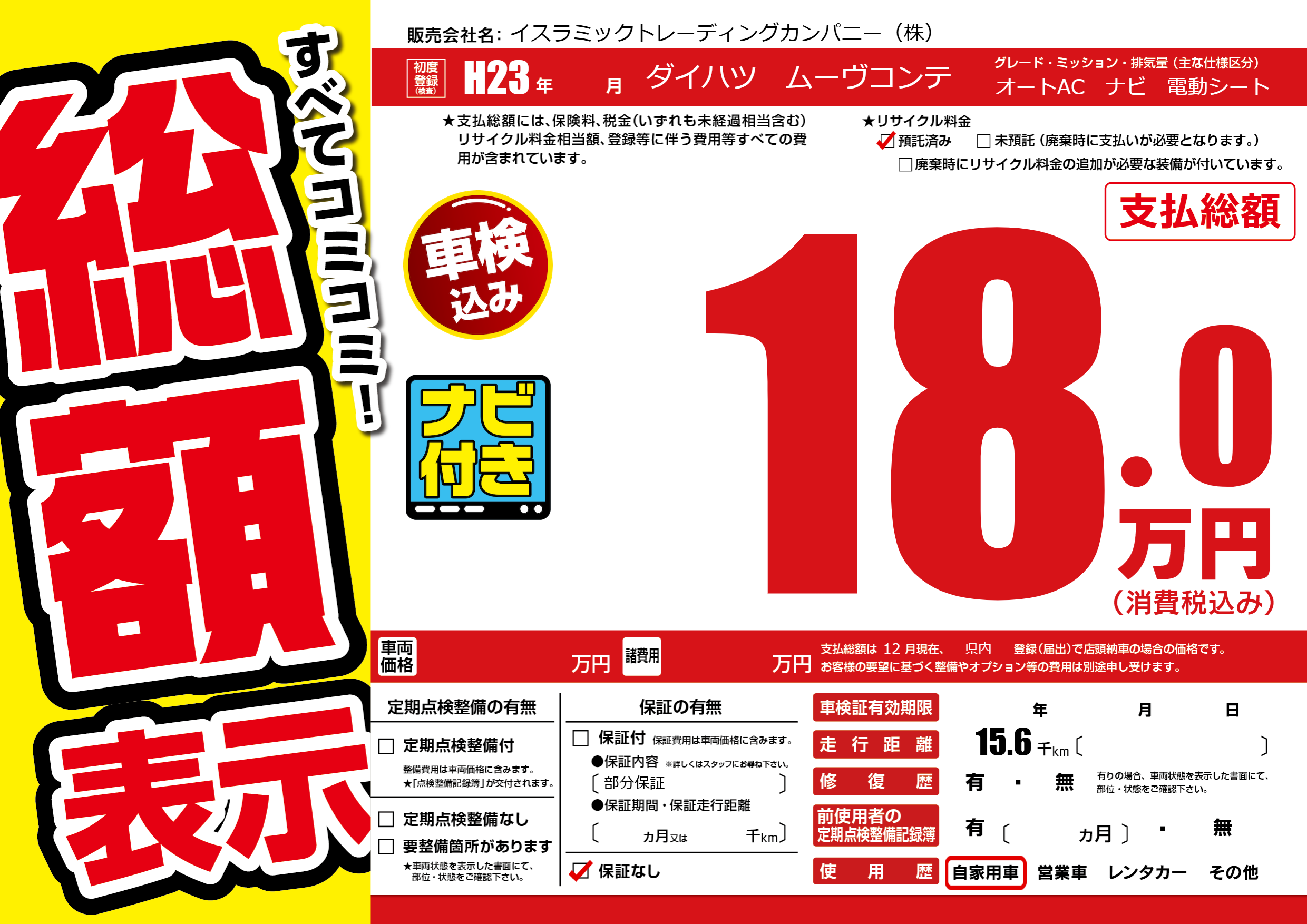 | 車名 | ダイハツ ムーヴコンテ | グレード ミッション 排気量 |