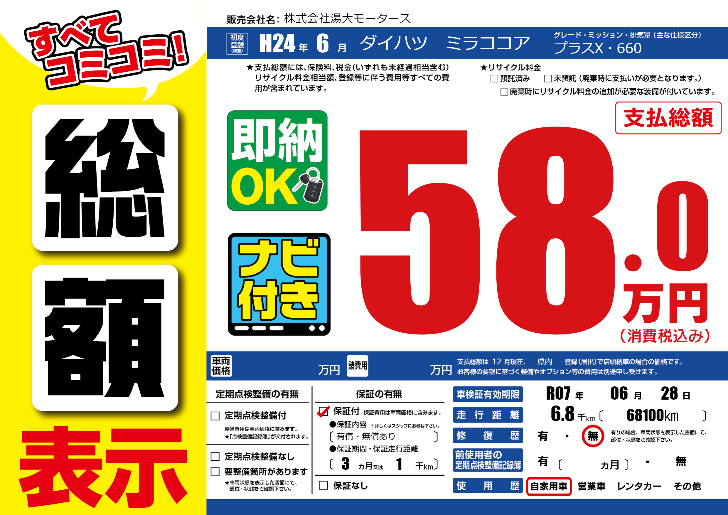 | 走行キロ | 0.6万km | 初年度登録 | H24年6月 |