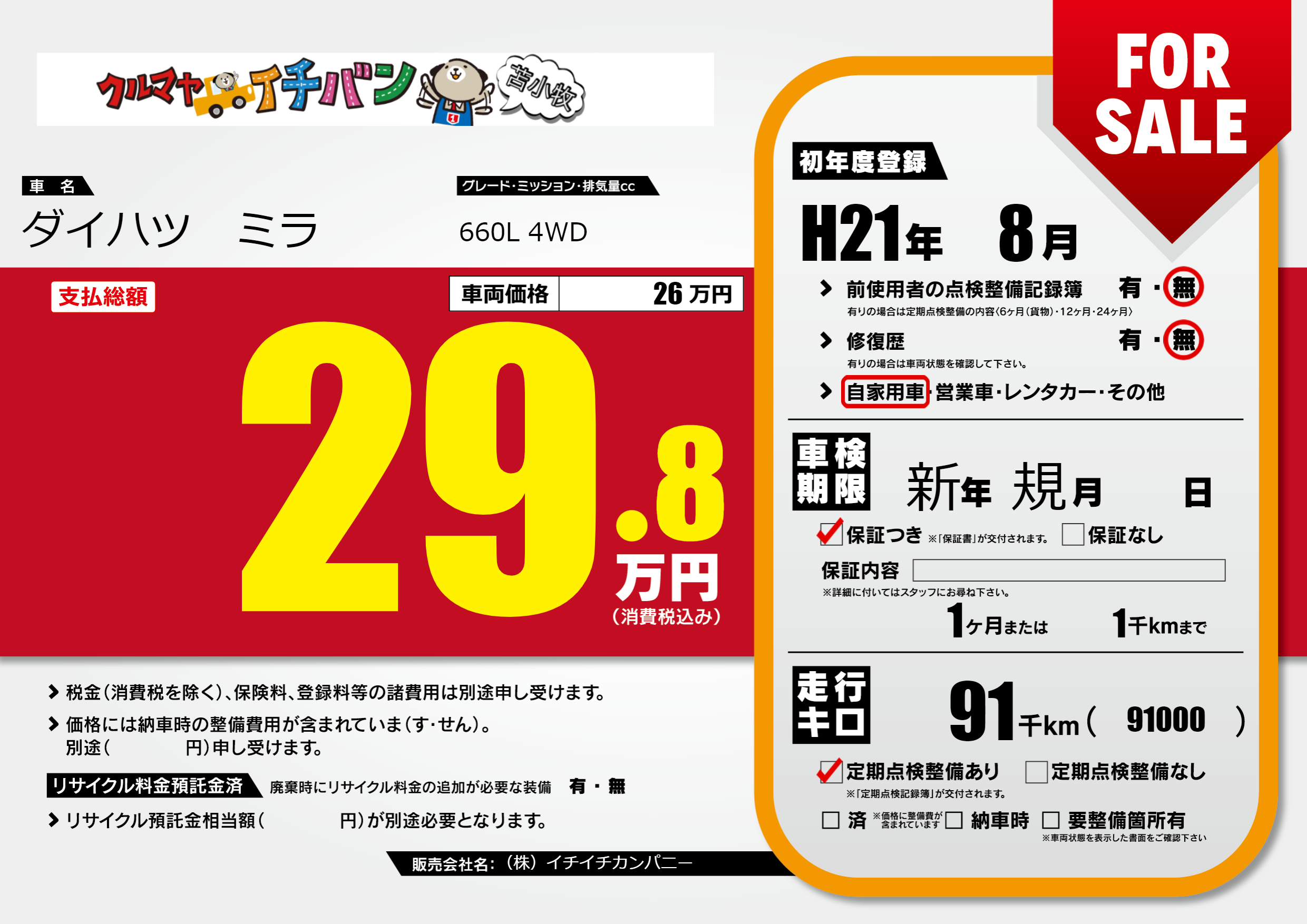 | 走行キロ | 9.1万km | 初年度登録 | H21年8月 |
