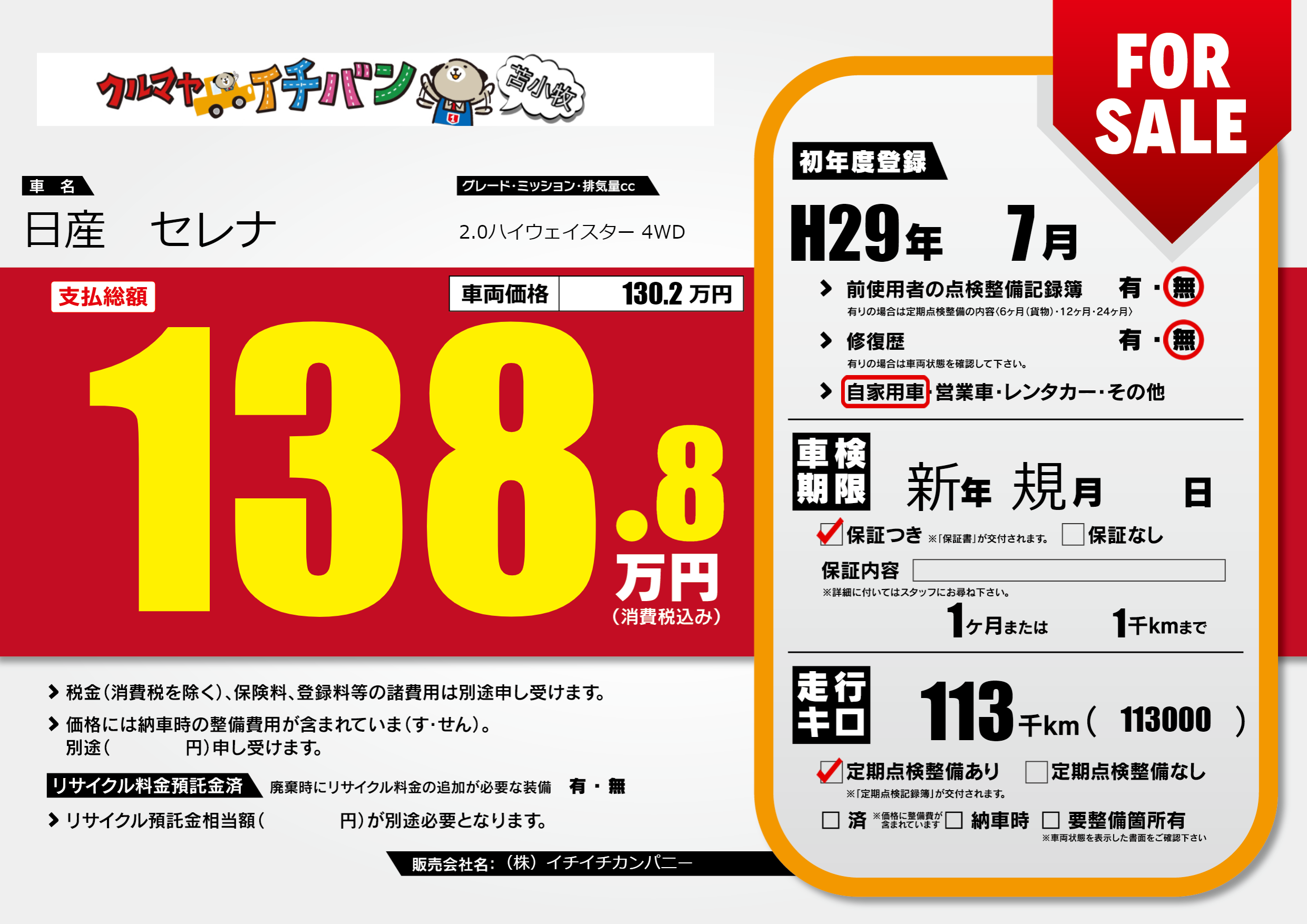 | 走行キロ | 11.3万km | 初年度登録 | H29年7月 |