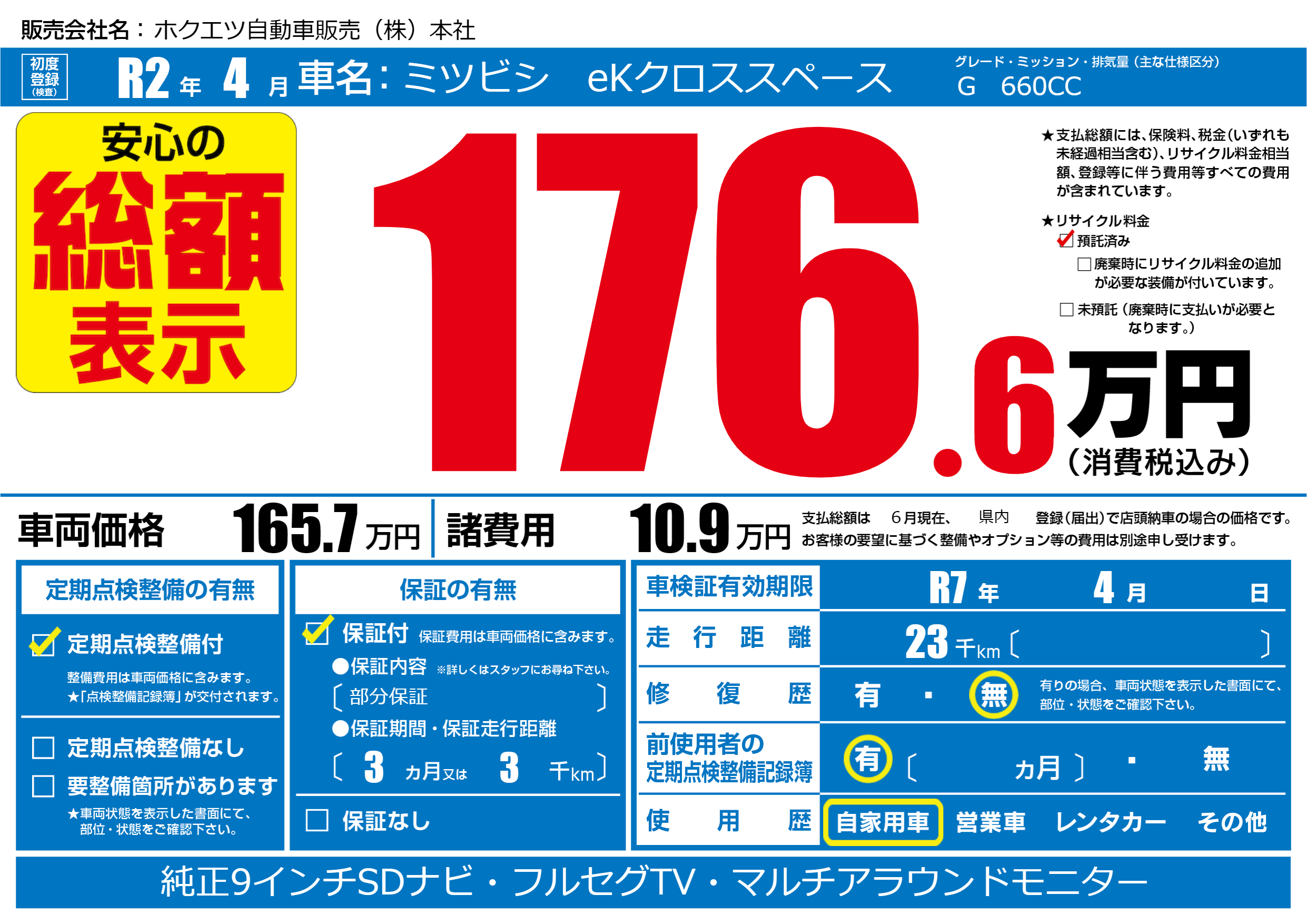 | 車名 | ミツビシ eKクロススペース | グレード ミッション 排気量 |