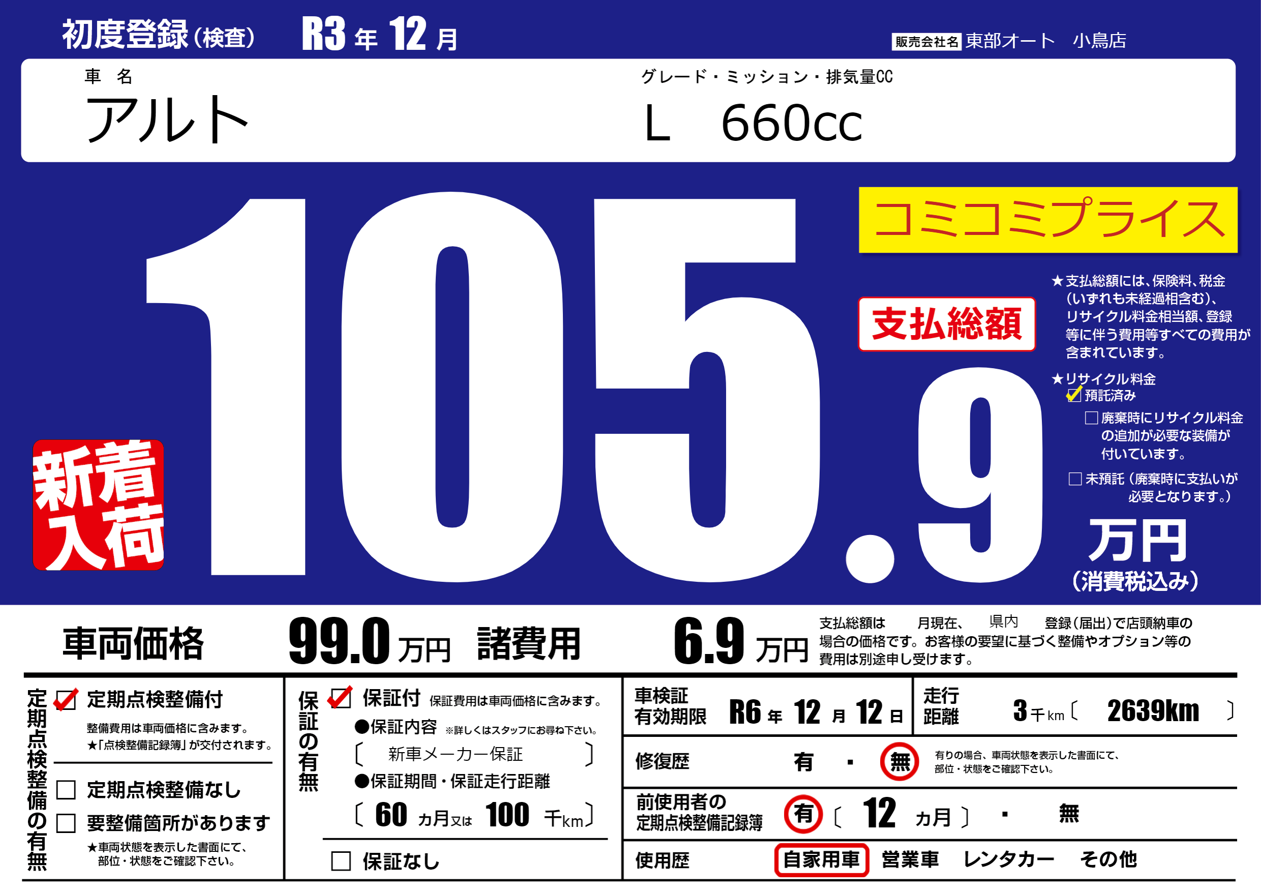 保証付き 保証内容( 新車メーカー保証) 60ヶ月または(100)千kmまで |