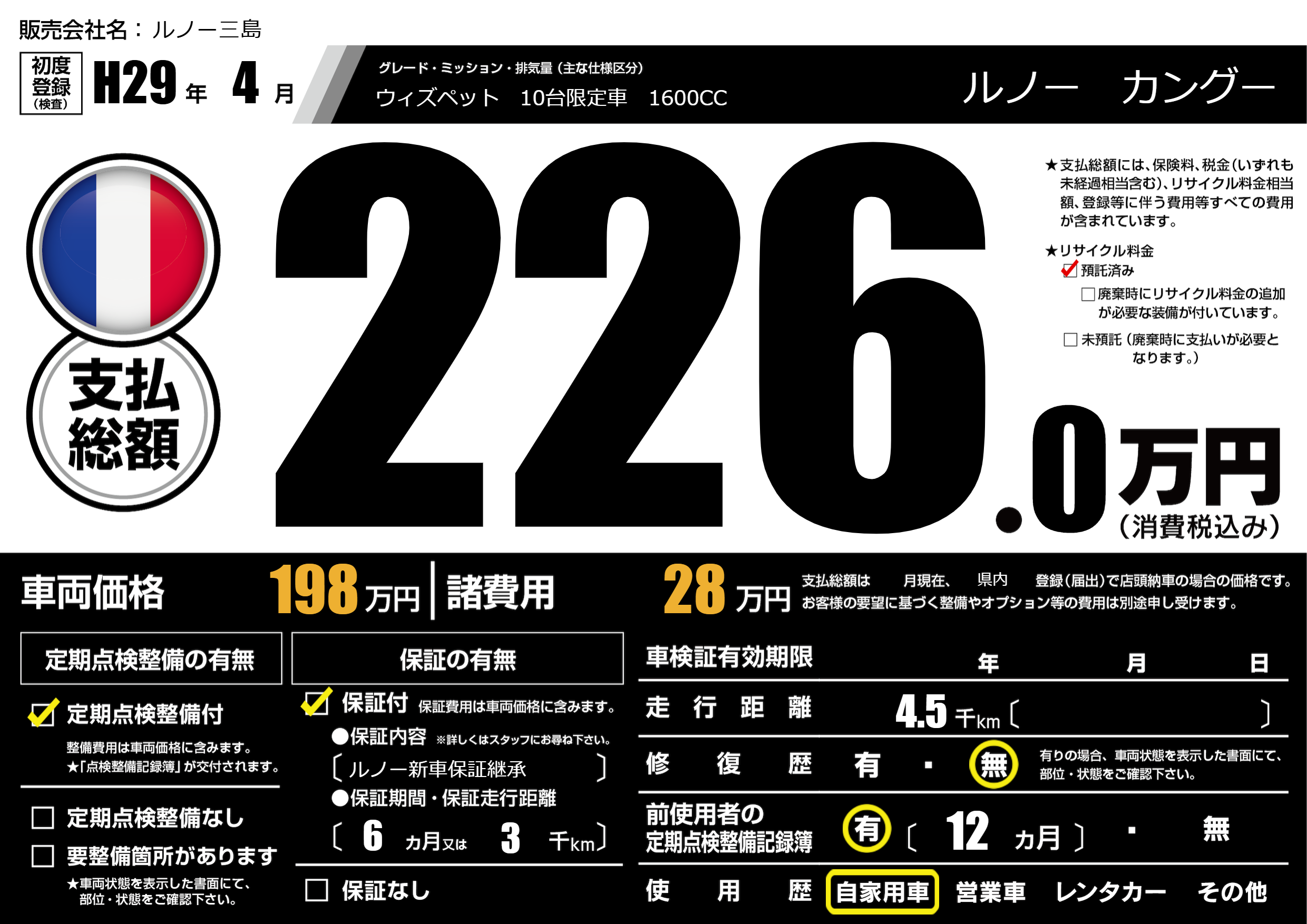 保証なし 保証内容(ルノー新車保証継承) 6ヶ月または(3)千kmまで |