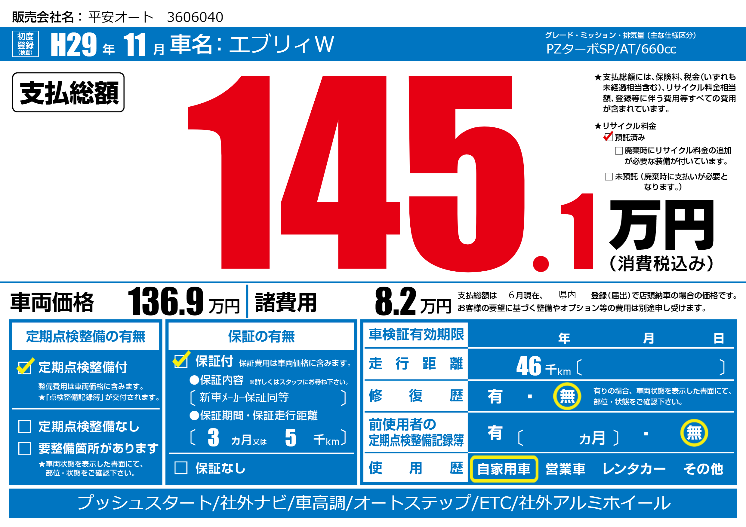| 走行キロ | 4.6万km | 初年度登録 | H29年11月 |