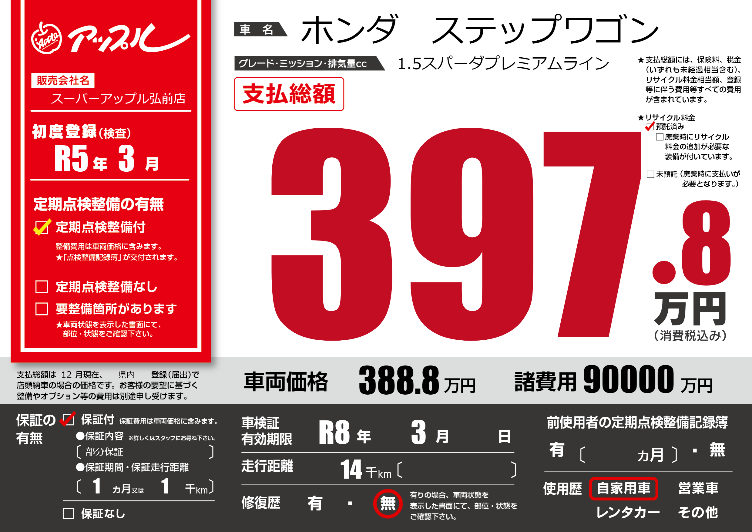 | 車名 | ホンダ ステップワゴン | グレード ミッション 排気量 |