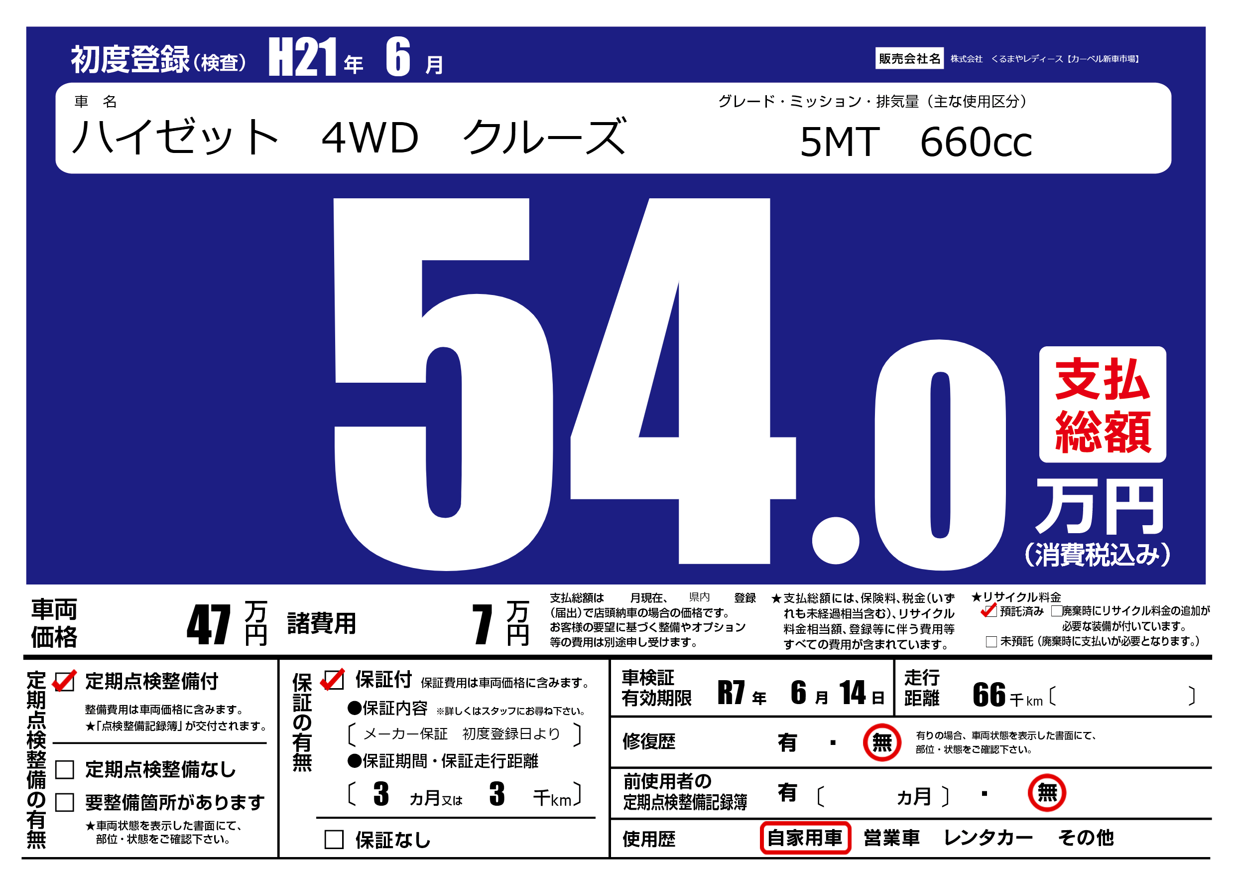 | 走行キロ | 6.6万km | 初年度登録 | H21年6月 |