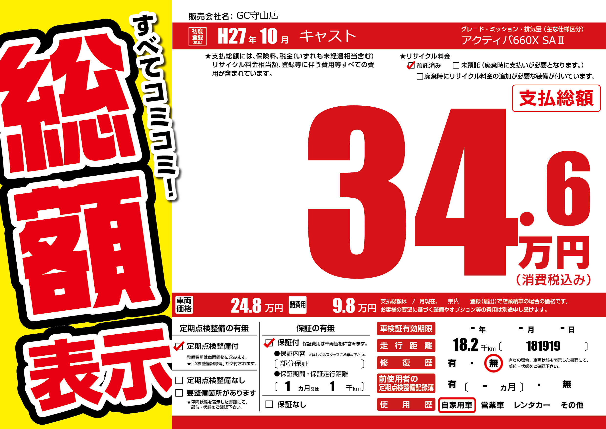 | 車名 | キャスト | グレード ミッション 排気量 |