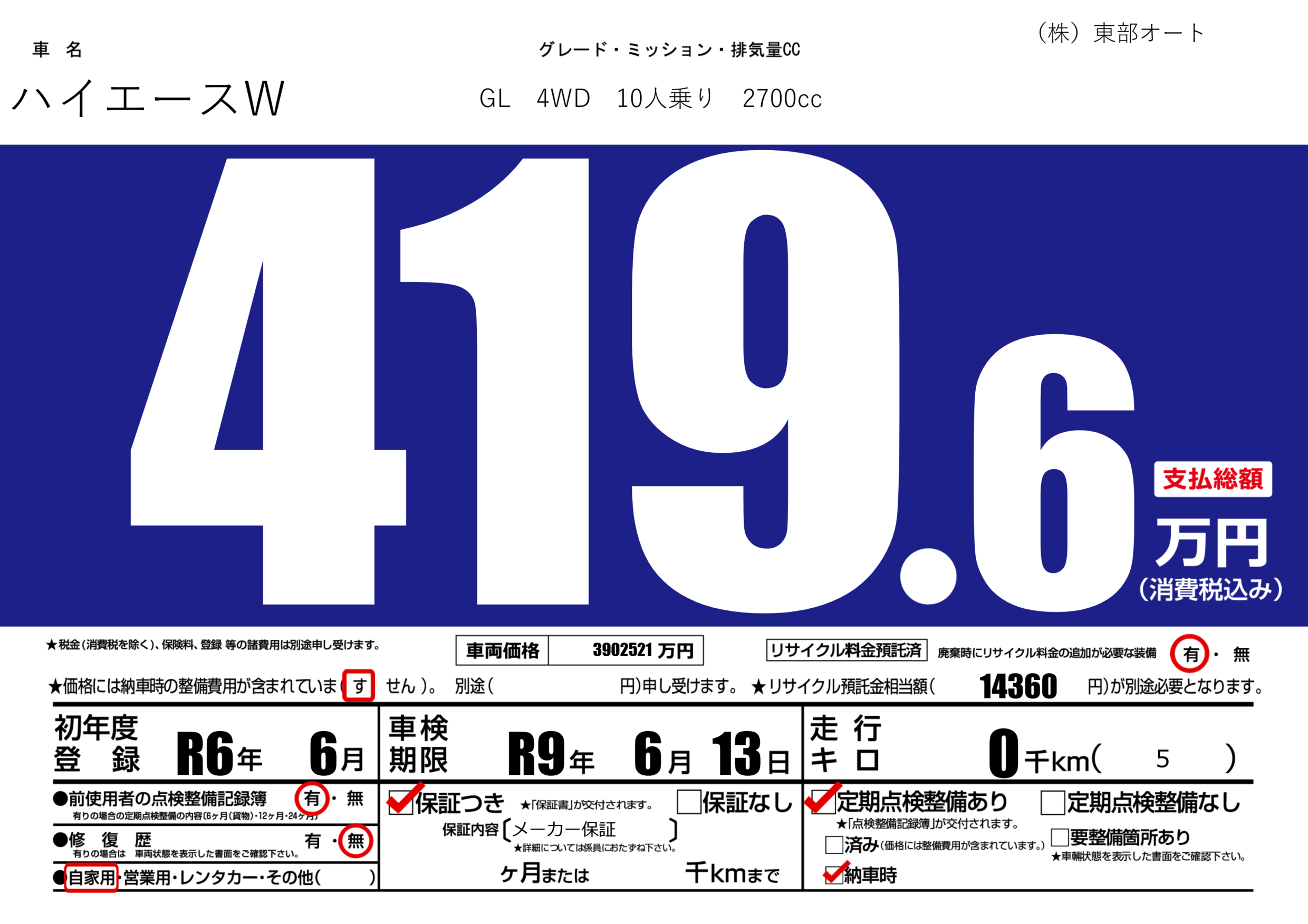 | 車名 | ハイエースW | グレード ミッション 排気量 |