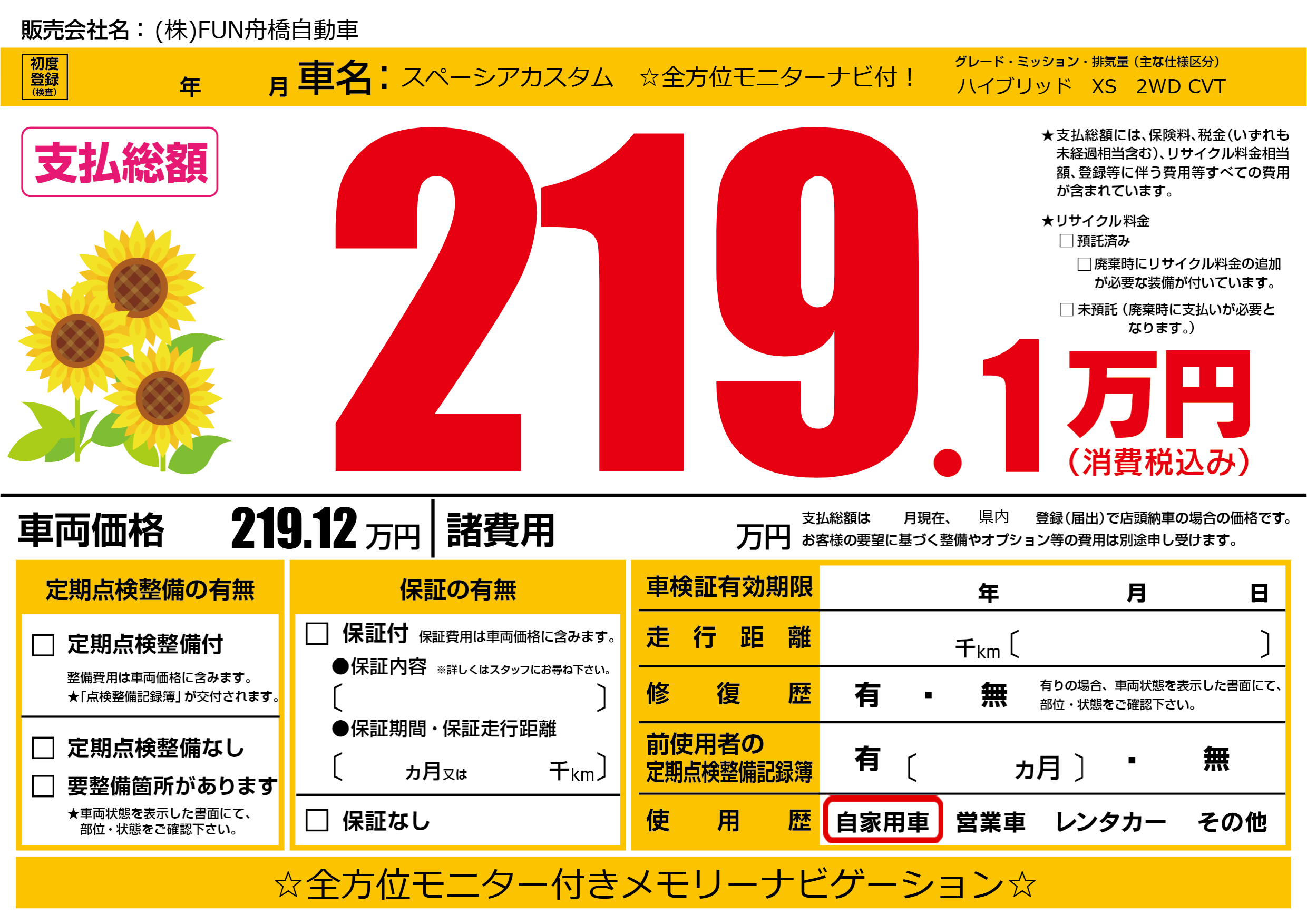 | 車名 | スペーシアカスタム ☆全方位モニターナビ付! | グレード ミッション 排気量 |