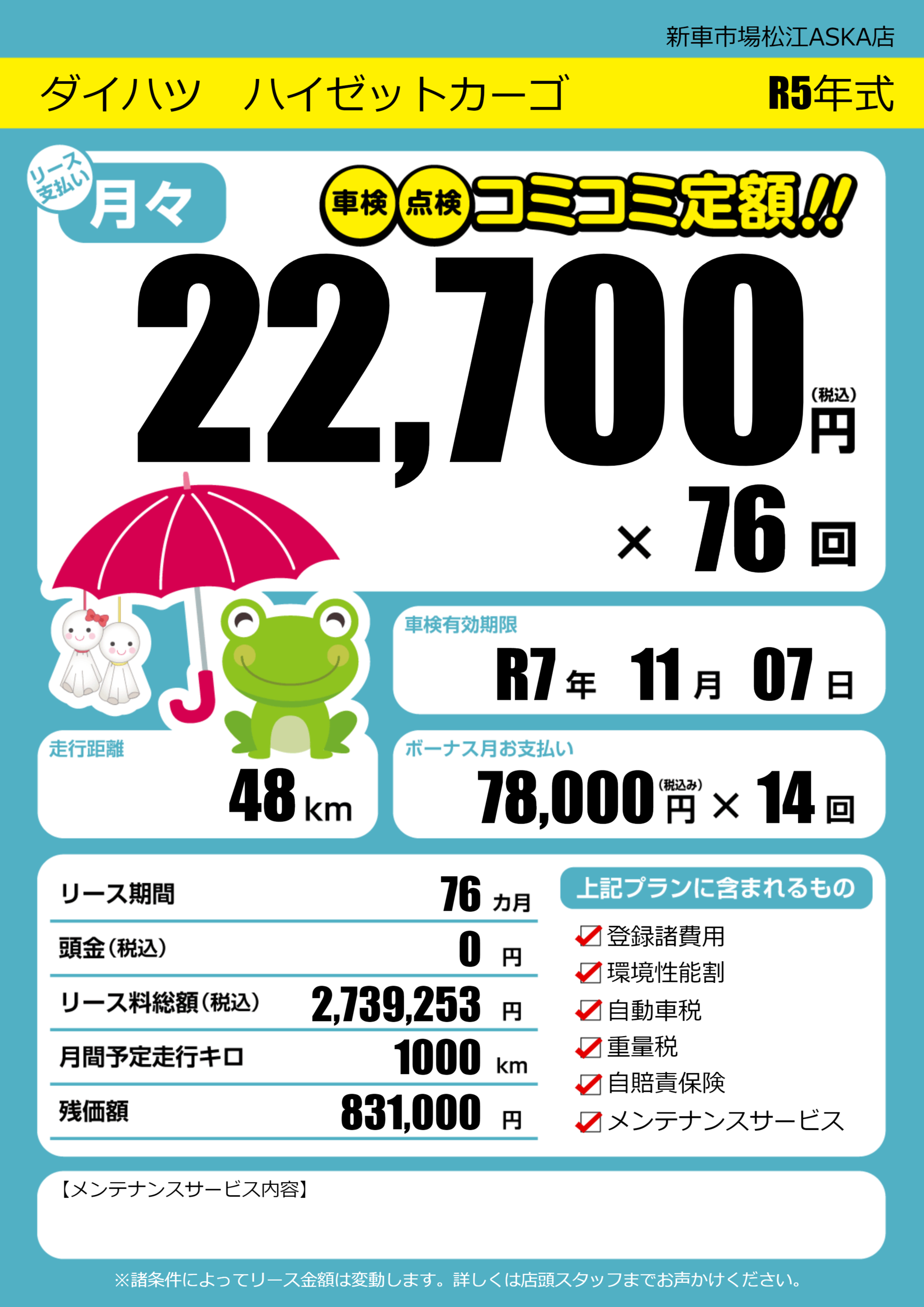 | 車名 | ダイハツ ハイゼットカーゴ | グレード ミッション 排気量 |