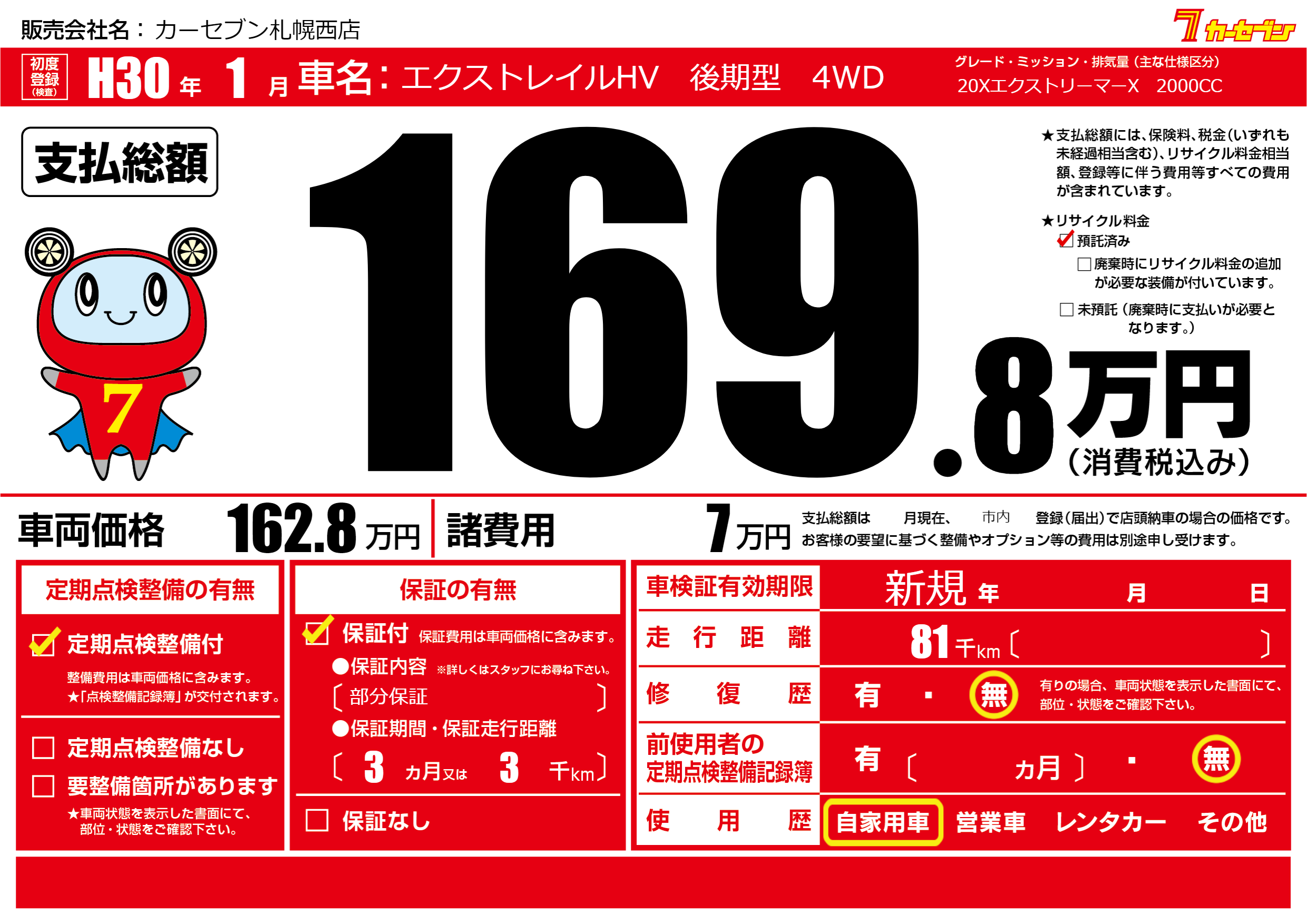 | 車名 | エクストレイルHV 後期型 4WD | グレード ミッション 排気量 |