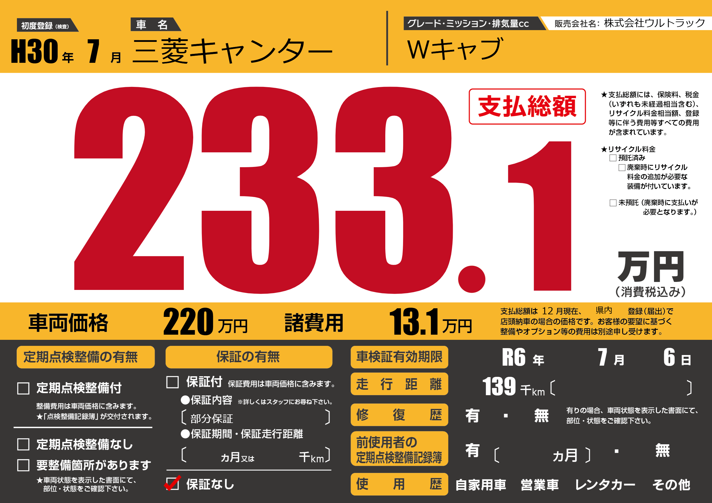 | 走行キロ | 13.9万km | 初年度登録 | H30年7月 |