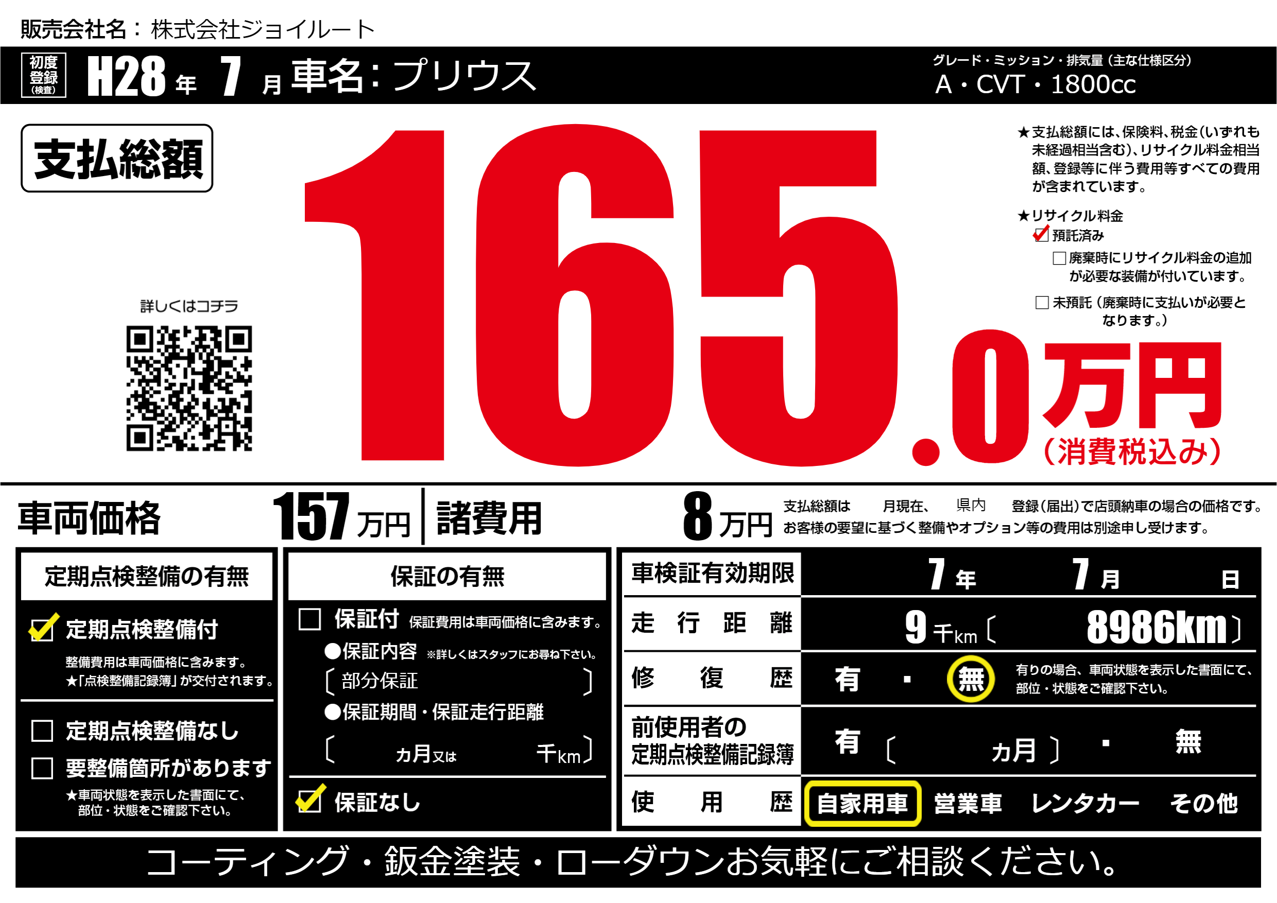 | 車名 | プリウス | グレード ミッション 排気量 |