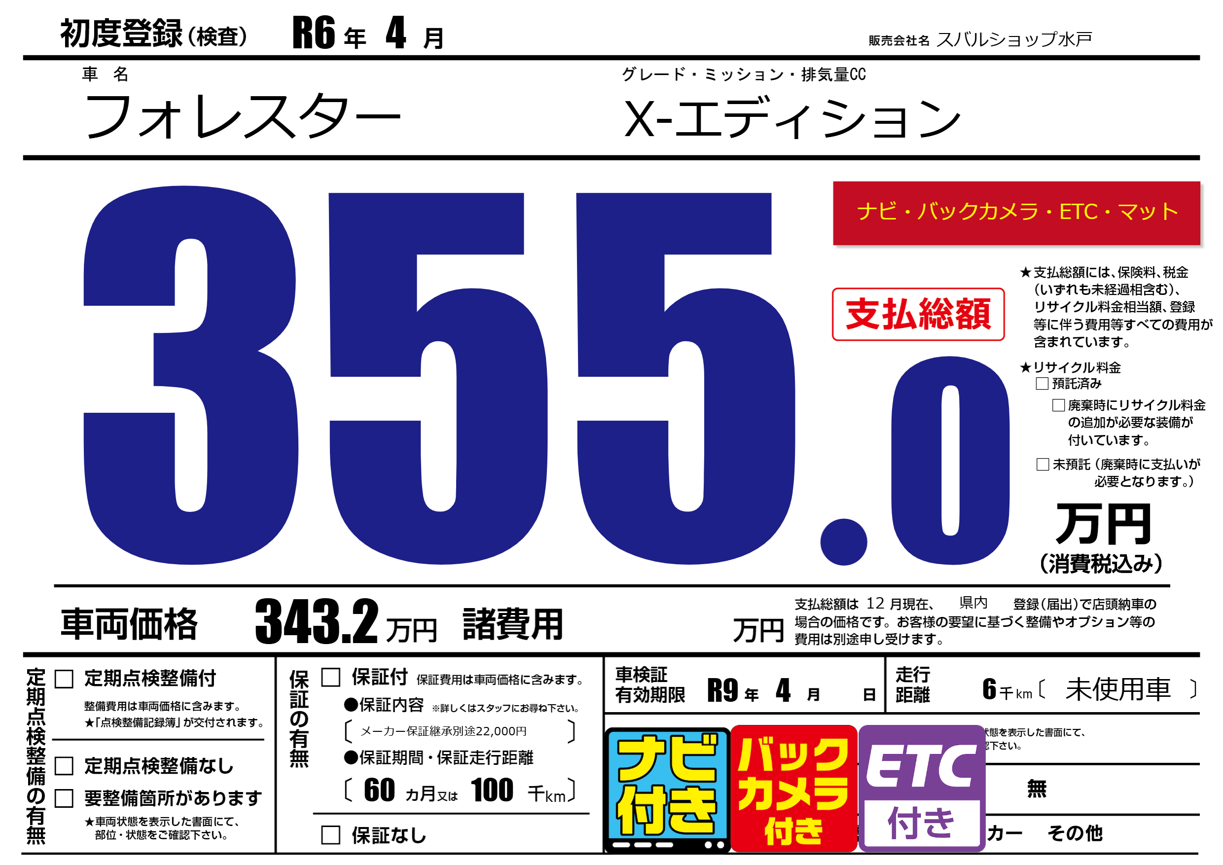 | 車名 | フォレスター | グレード ミッション 排気量 |