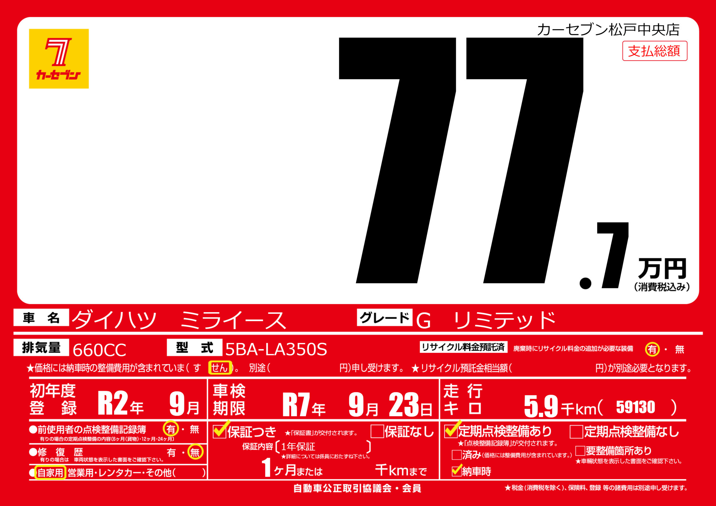 | 走行キロ | 0.5万km | 初年度登録 | R2年9月 |