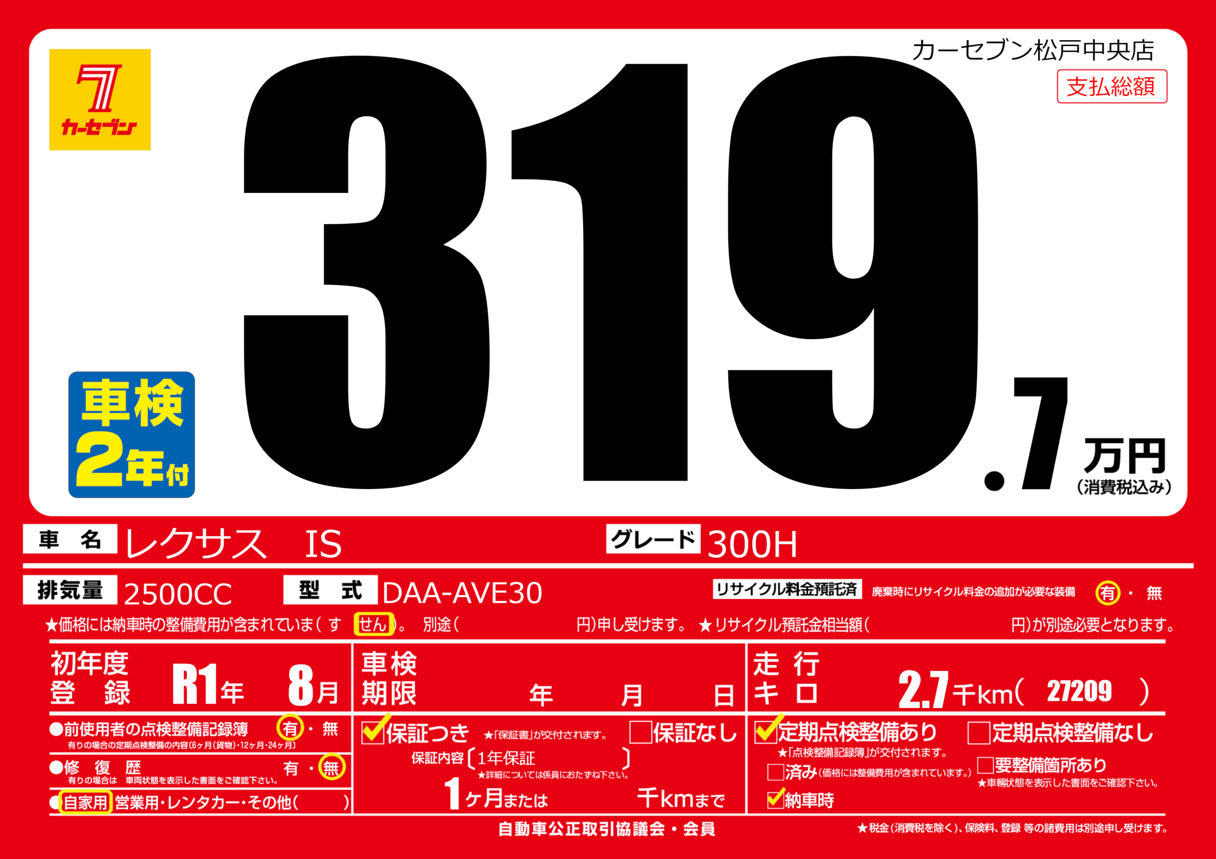 | 車名 | レクサス IS | グレード ミッション 排気量 |