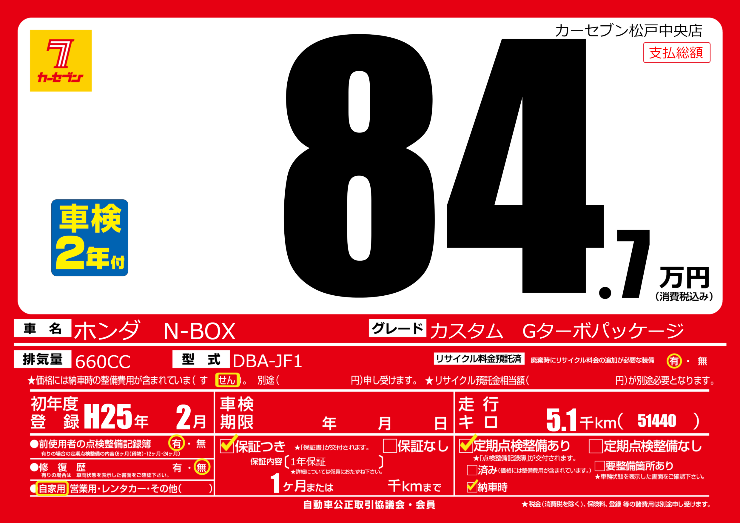 | 車名 | ホンダ N-BOX | グレード ミッション 排気量 |