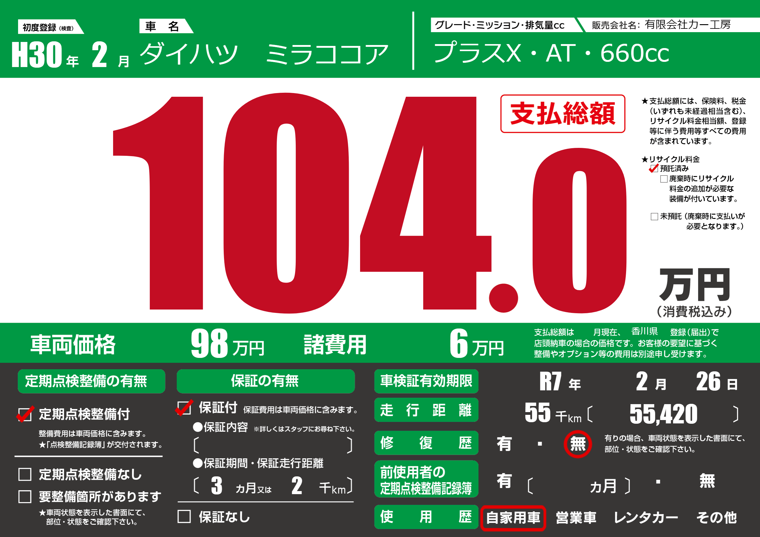| 走行キロ | 5.5万km | 初年度登録 | H30年2月 |