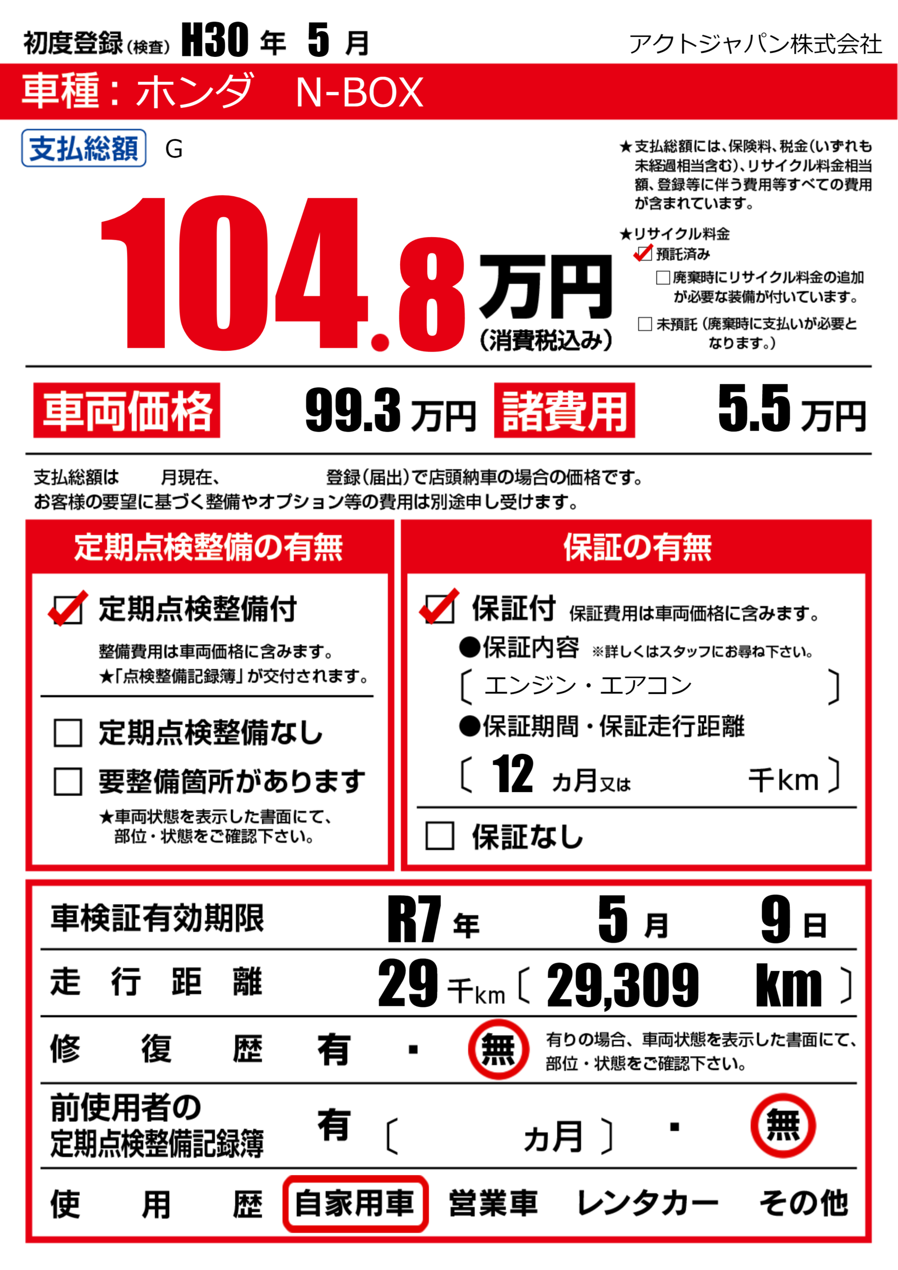 | 走行キロ | 2.9万km | 初年度登録 | H30年5月 |