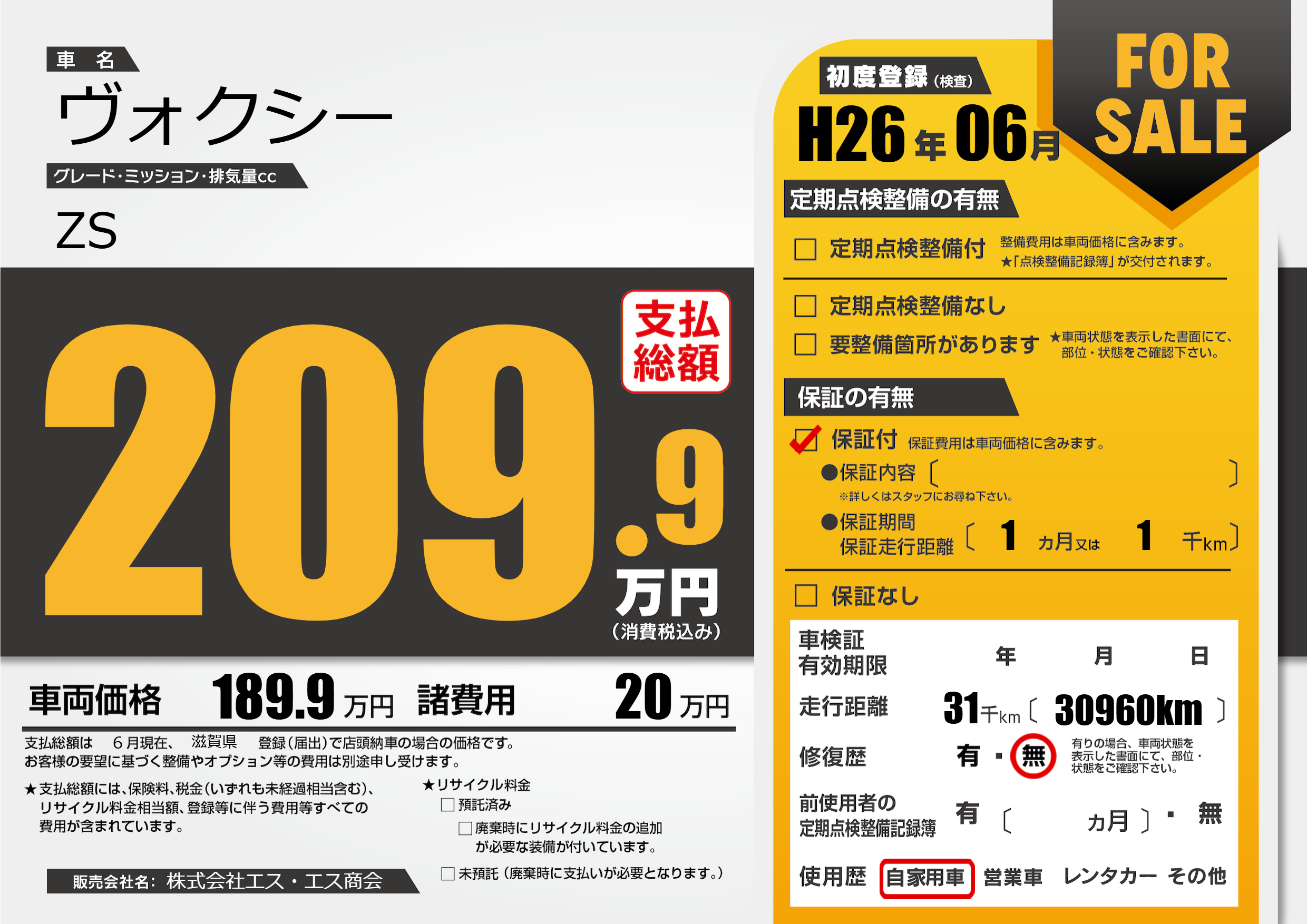 | 走行キロ | 3.1万km | 初年度登録 | H26年06月 |