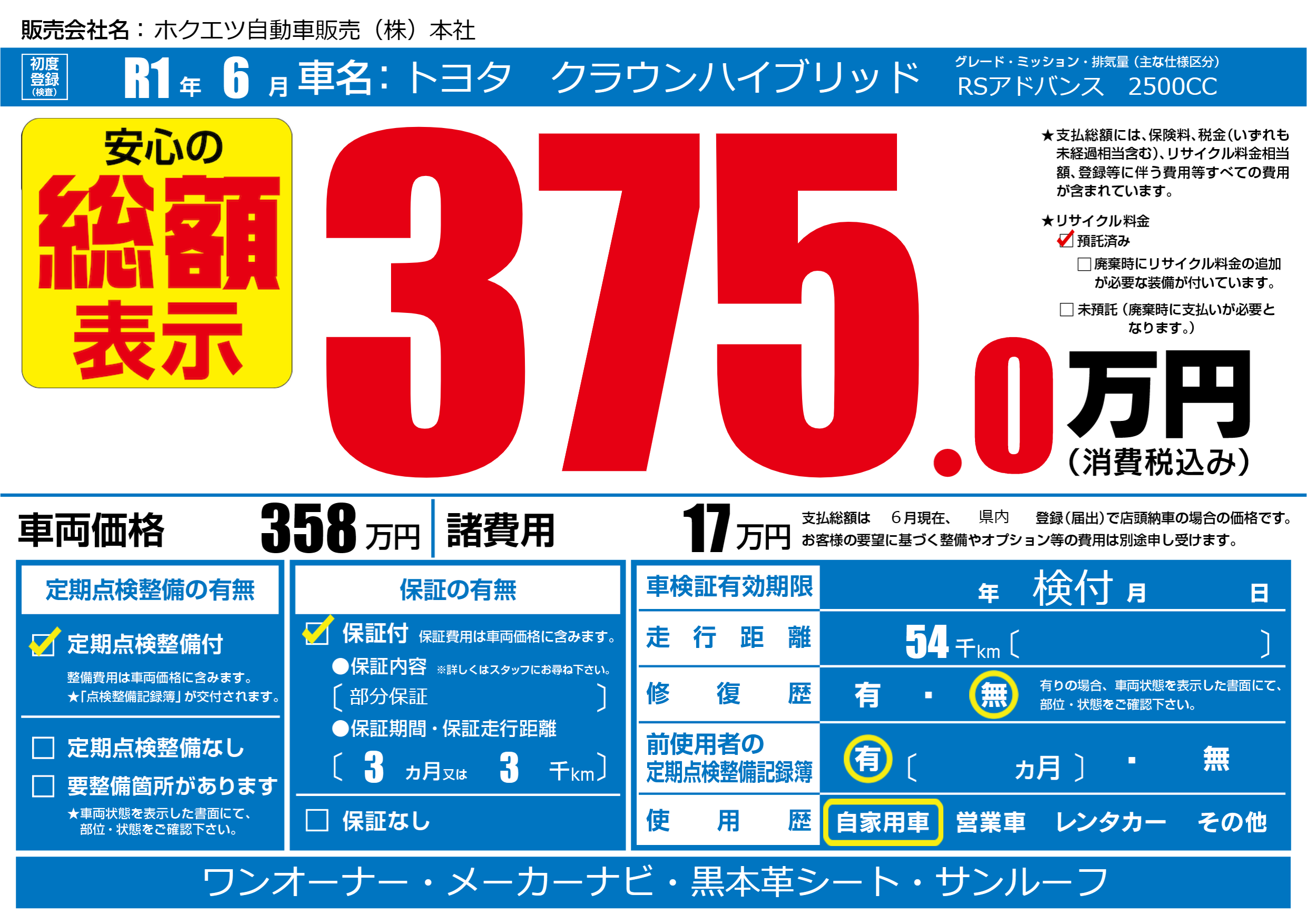 | 車名 | トヨタ クラウンハイブリッド | グレード ミッション 排気量 |