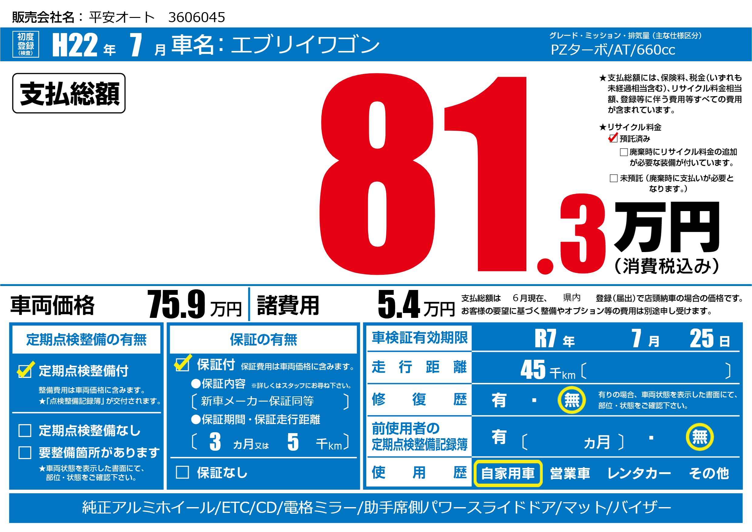 なし | 車検制限 | R7年7月25月 |