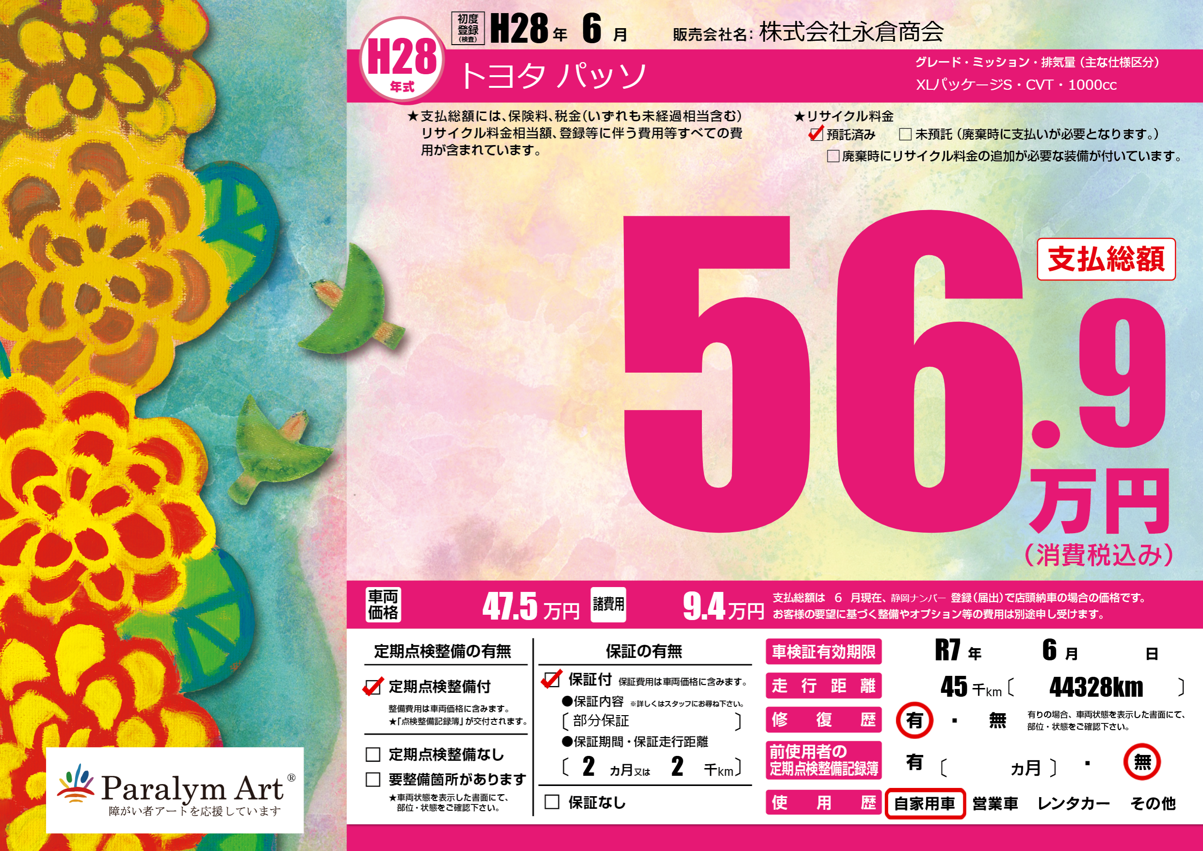 | 車名 | トヨタ パッソ | グレード ミッション 排気量 |