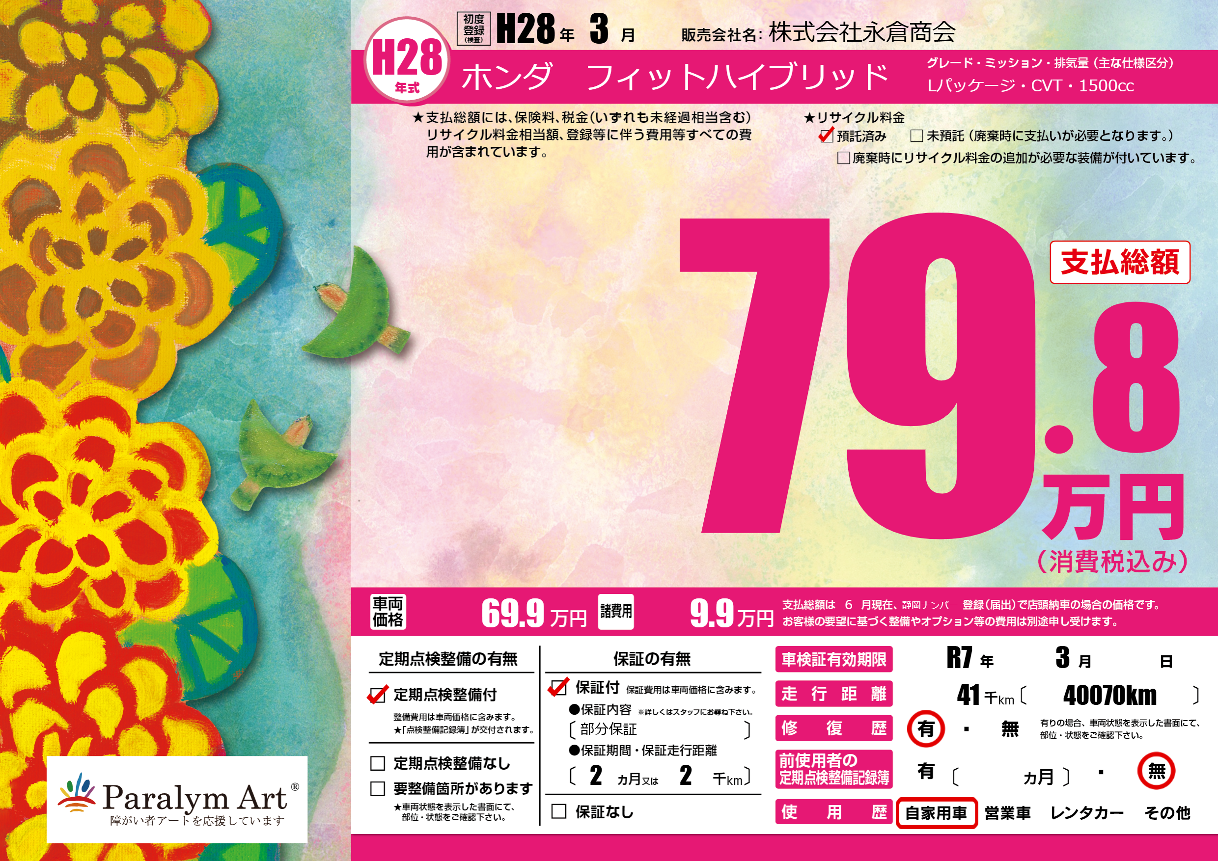 | 車名 | ホンダ フィットハイブリッド | グレード ミッション 排気量 |