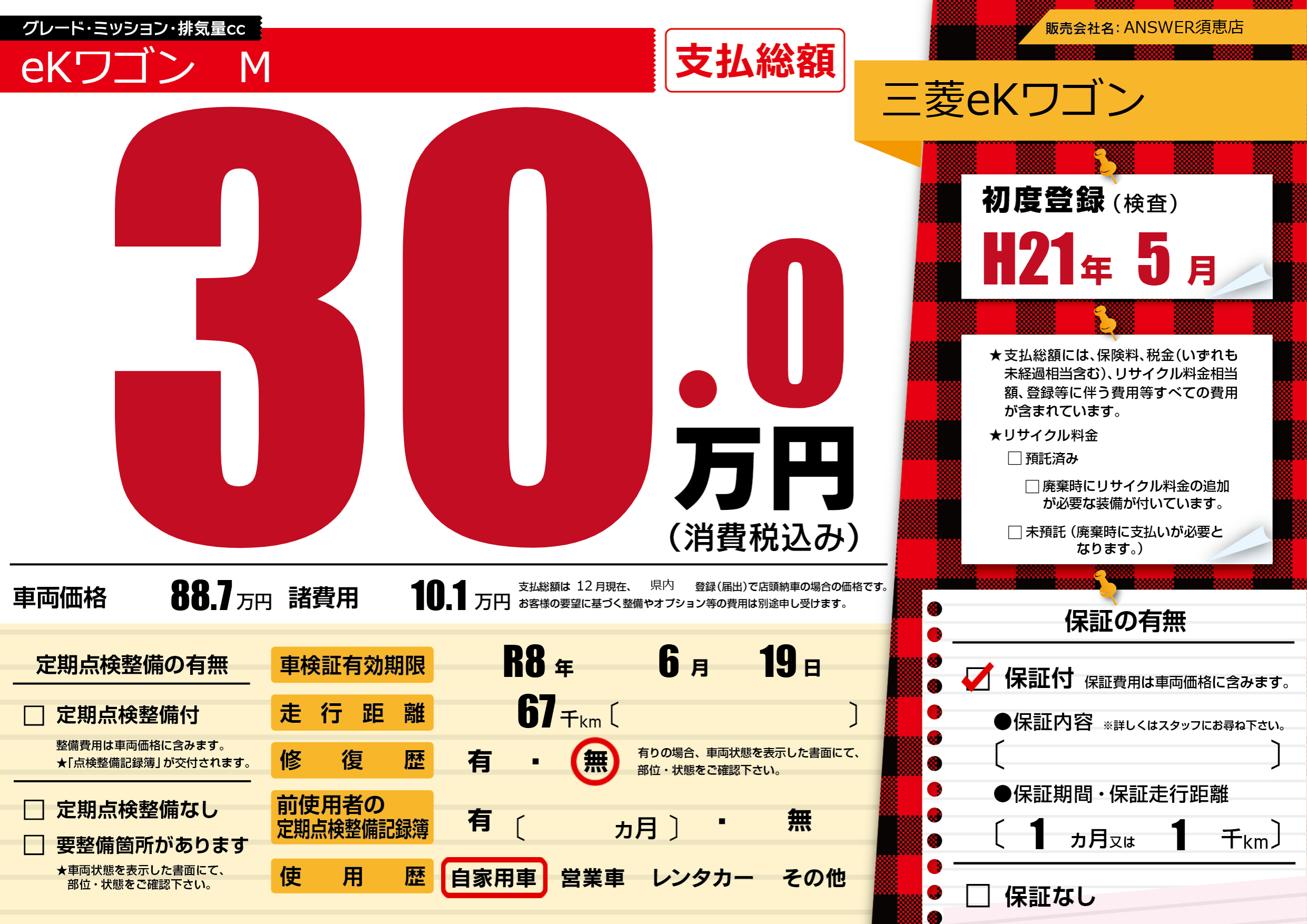 保証付き 保証内容(---) 1ヶ月または(1)千kmまで |