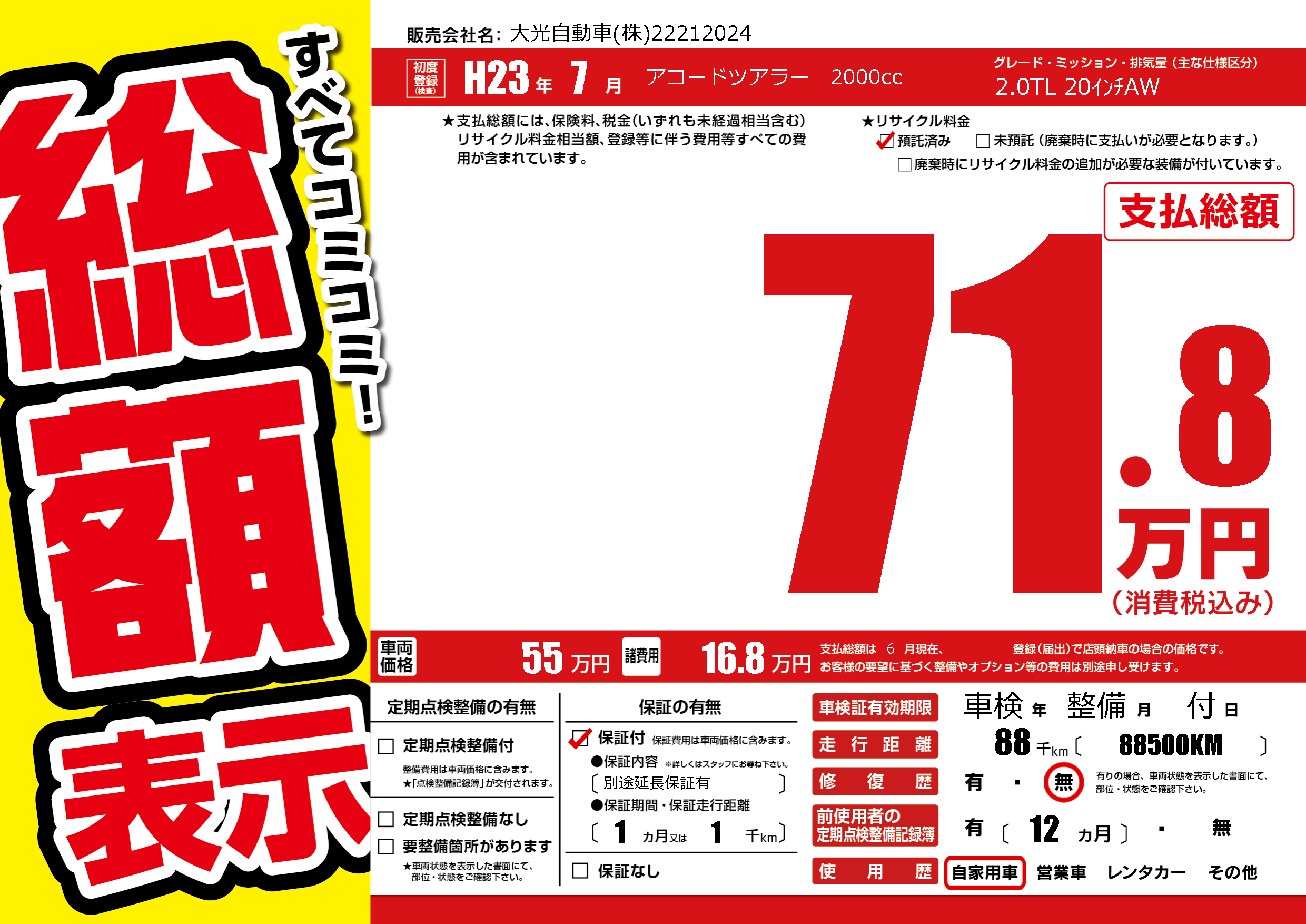 | 走行キロ | 8.8万km | 初年度登録 | H23年7月 |