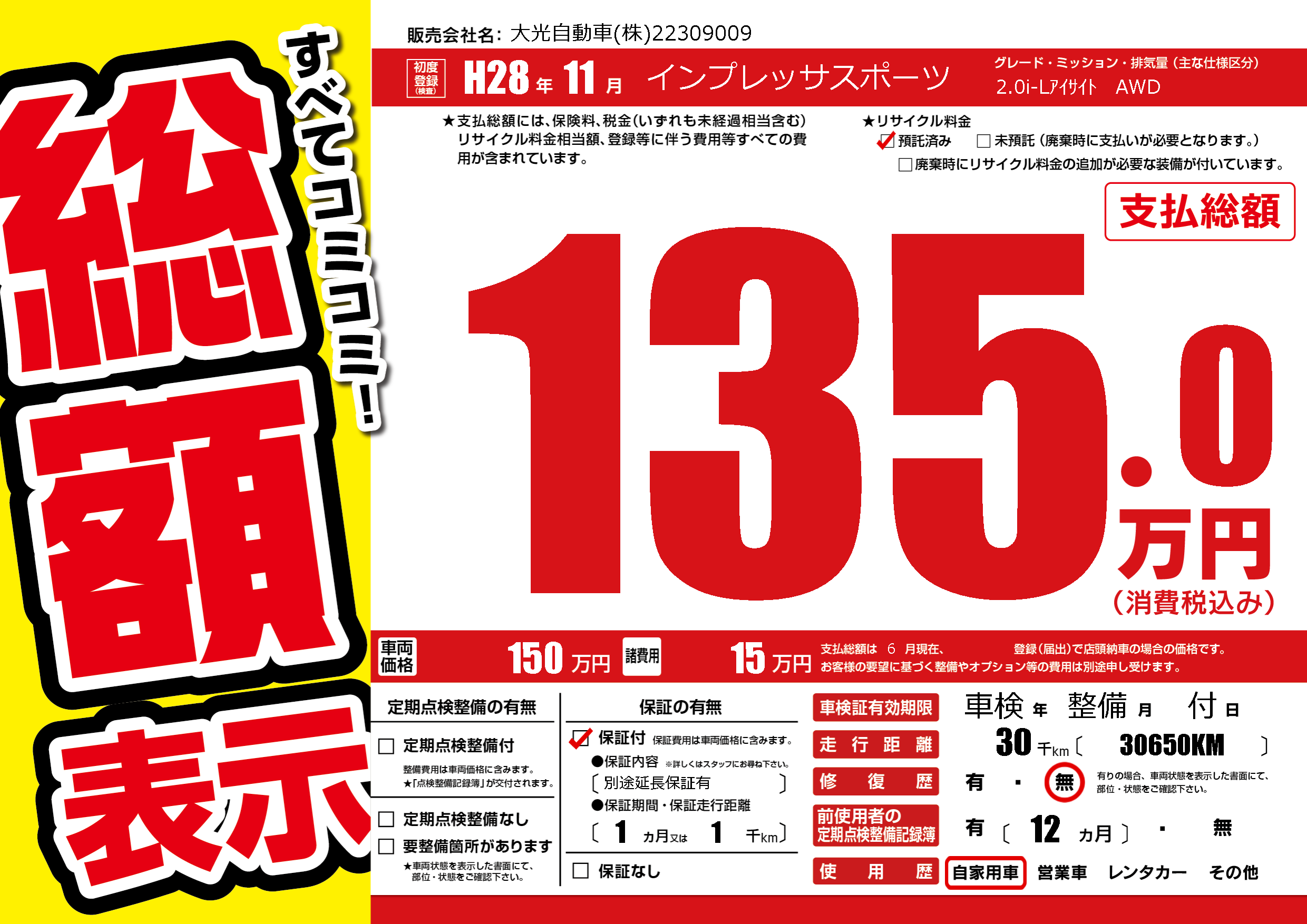 | 車名 | インプレッサスポーツ | グレード ミッション 排気量 |