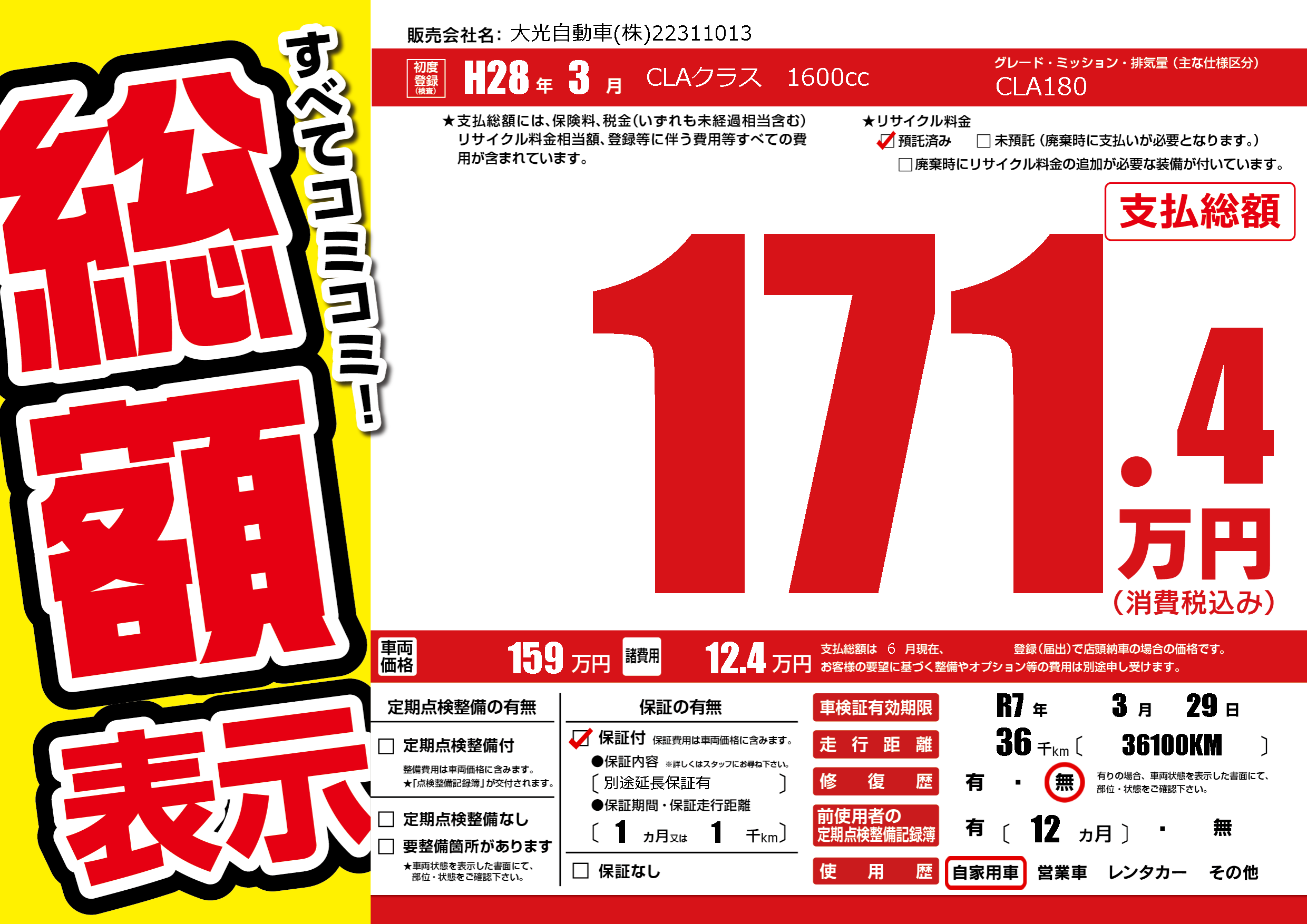 | 車名 | CLAクラス 1600cc | グレード ミッション 排気量 |