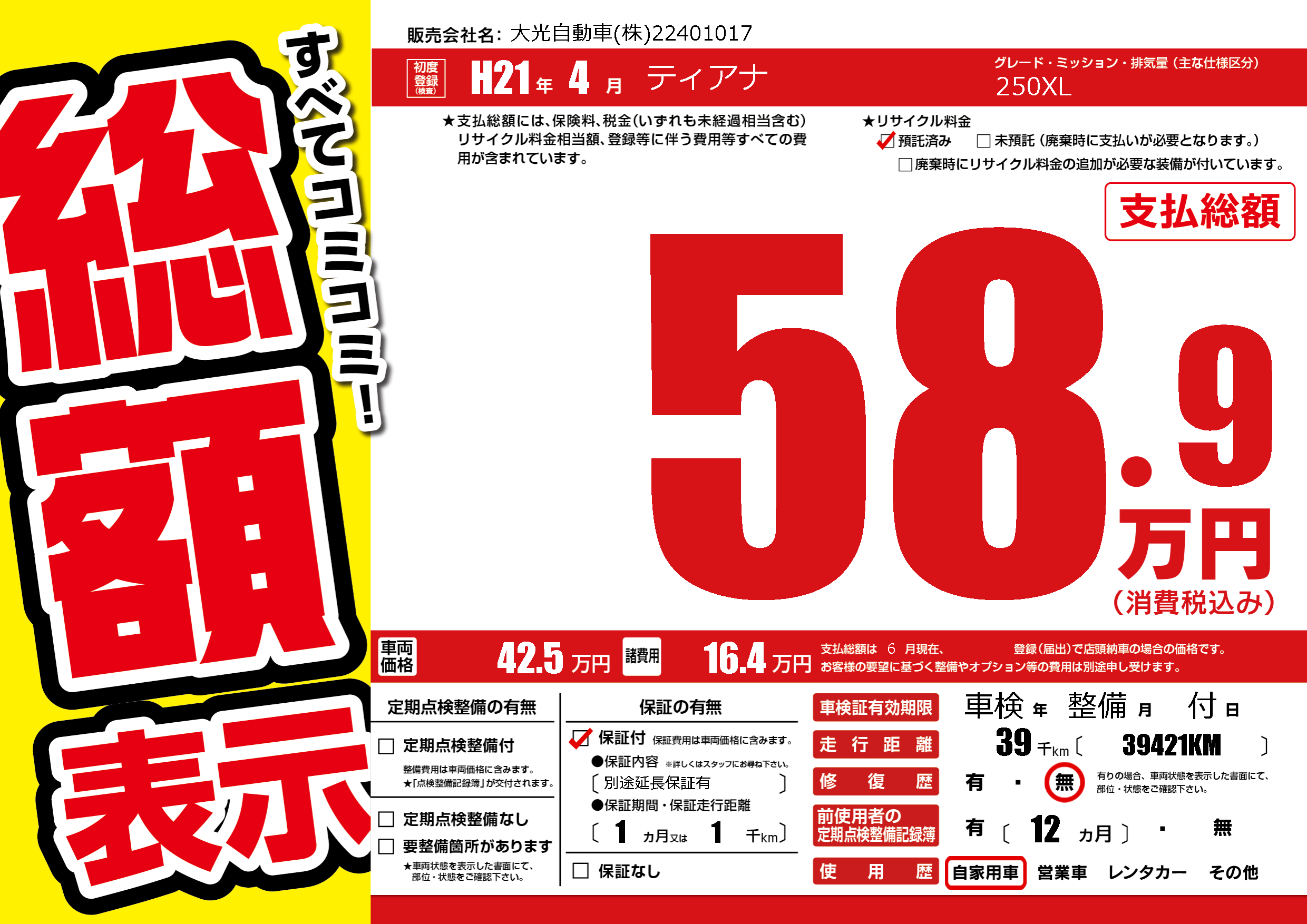 | 車名 | ティアナ | グレード ミッション 排気量 |