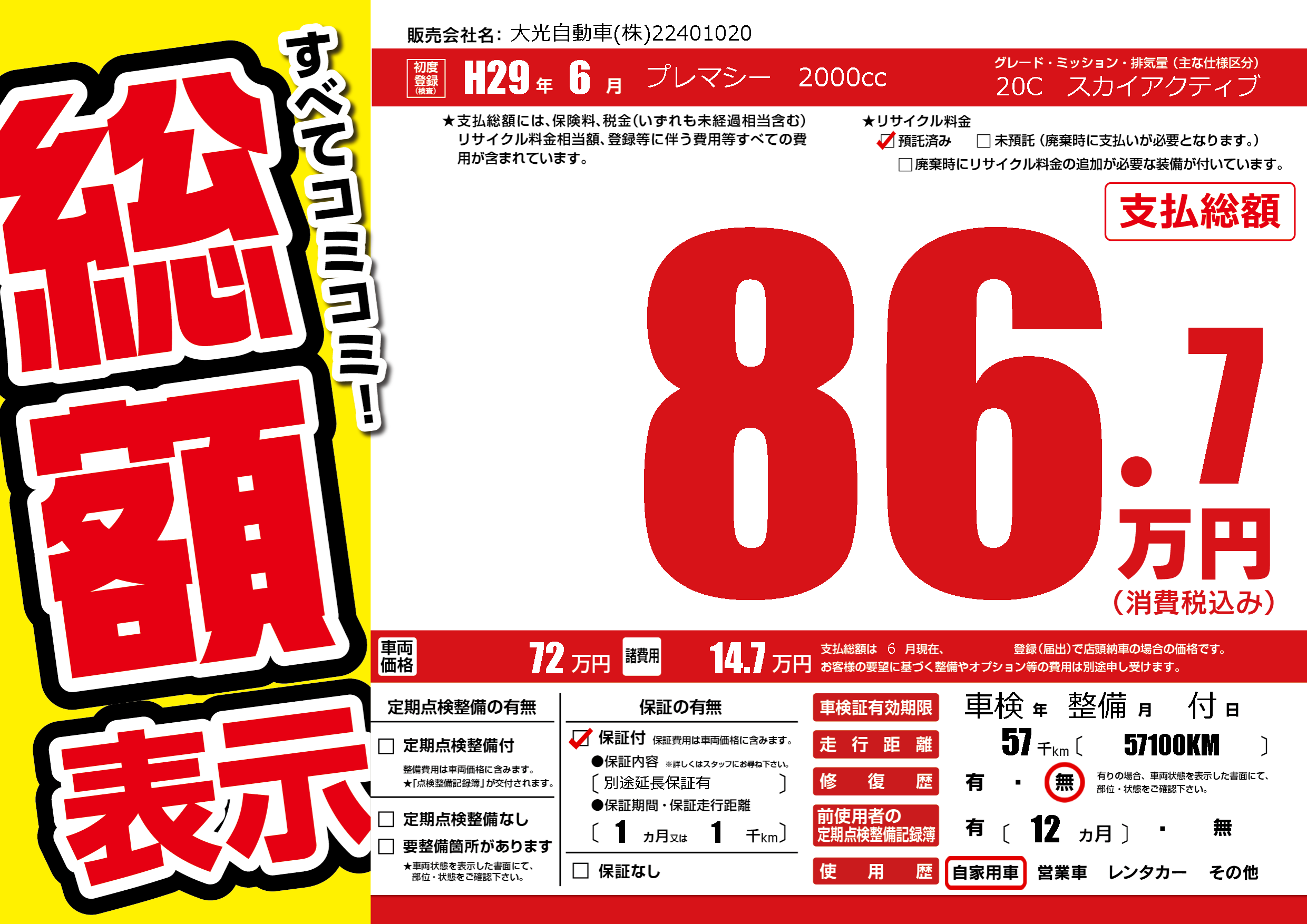 | 車名 | プレマシー 2000cc | グレード ミッション 排気量 |