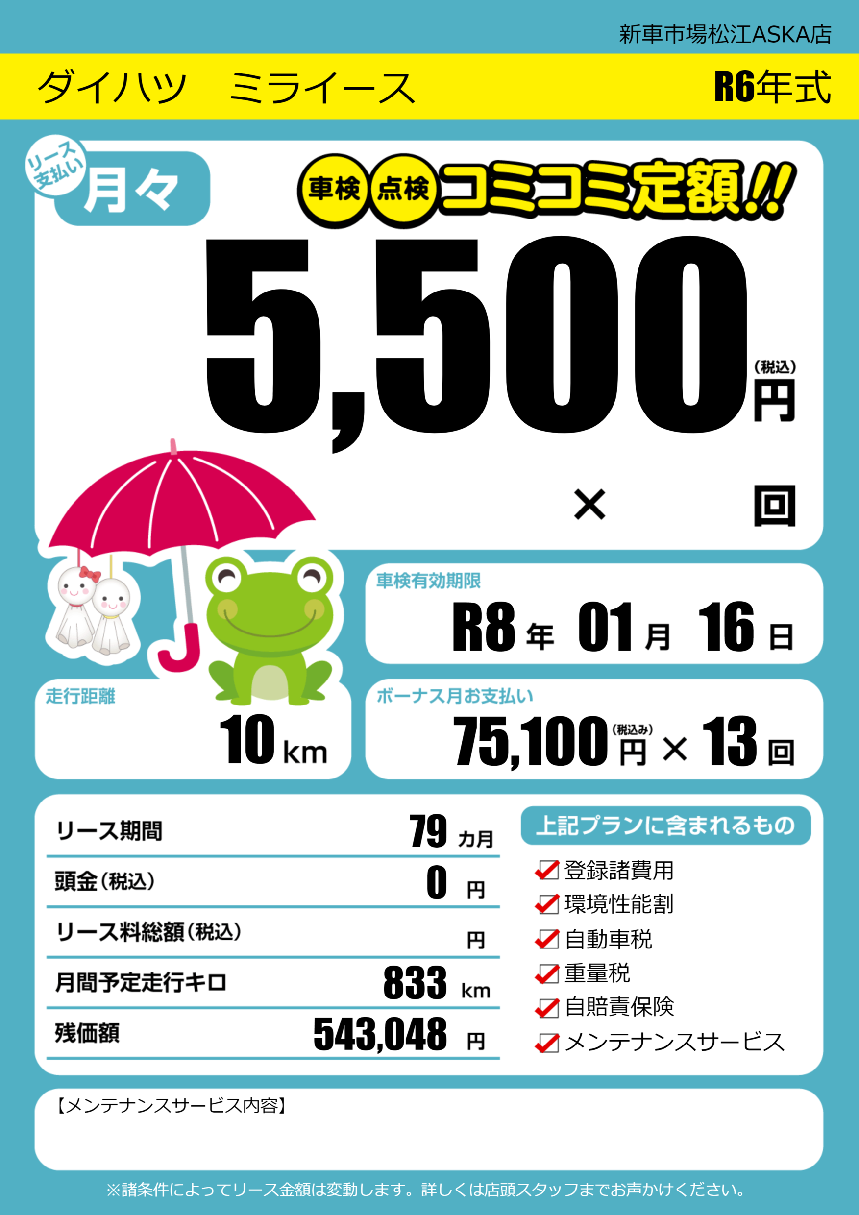 | 車名 | ダイハツ ミライース | グレード ミッション 排気量 |