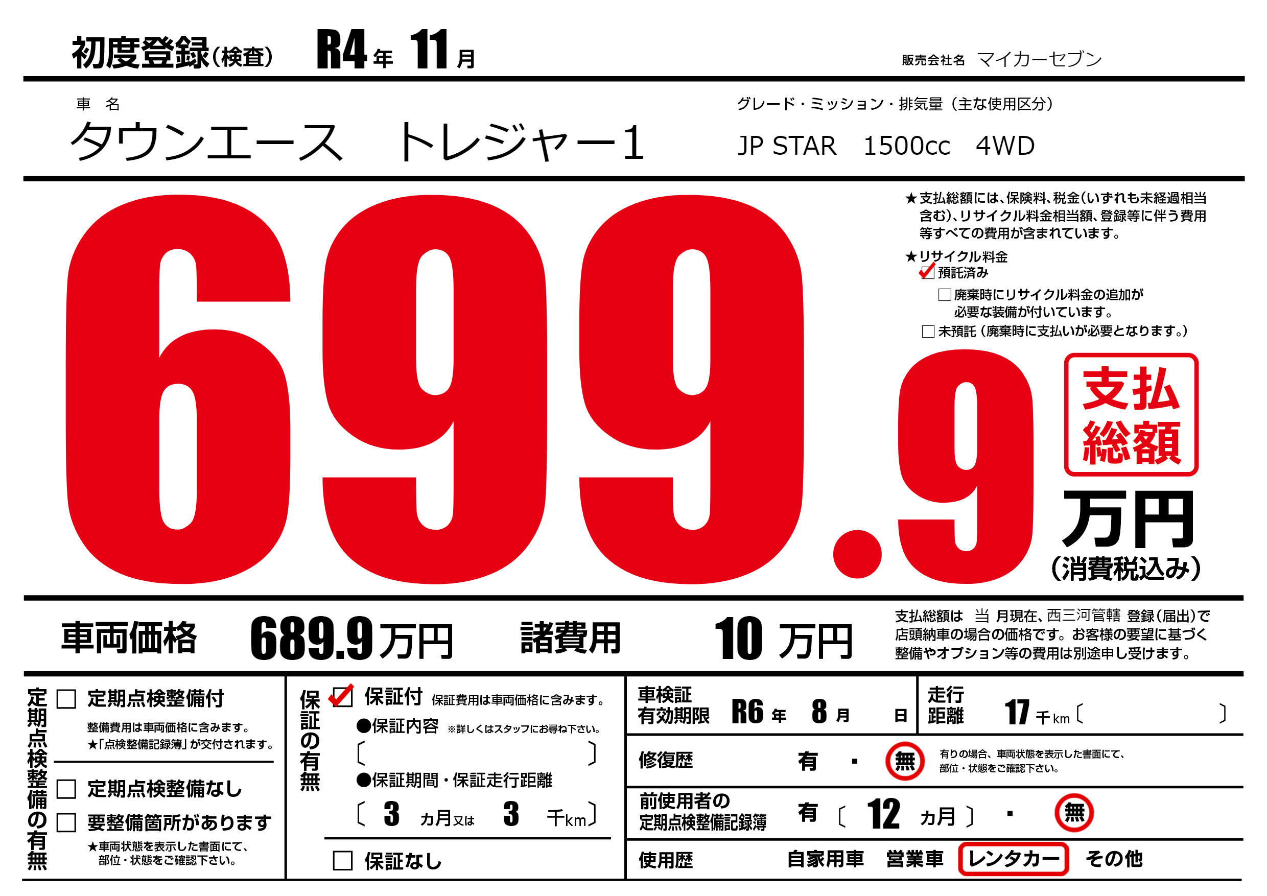 なし | 車検制限 | R6年8月---月 |