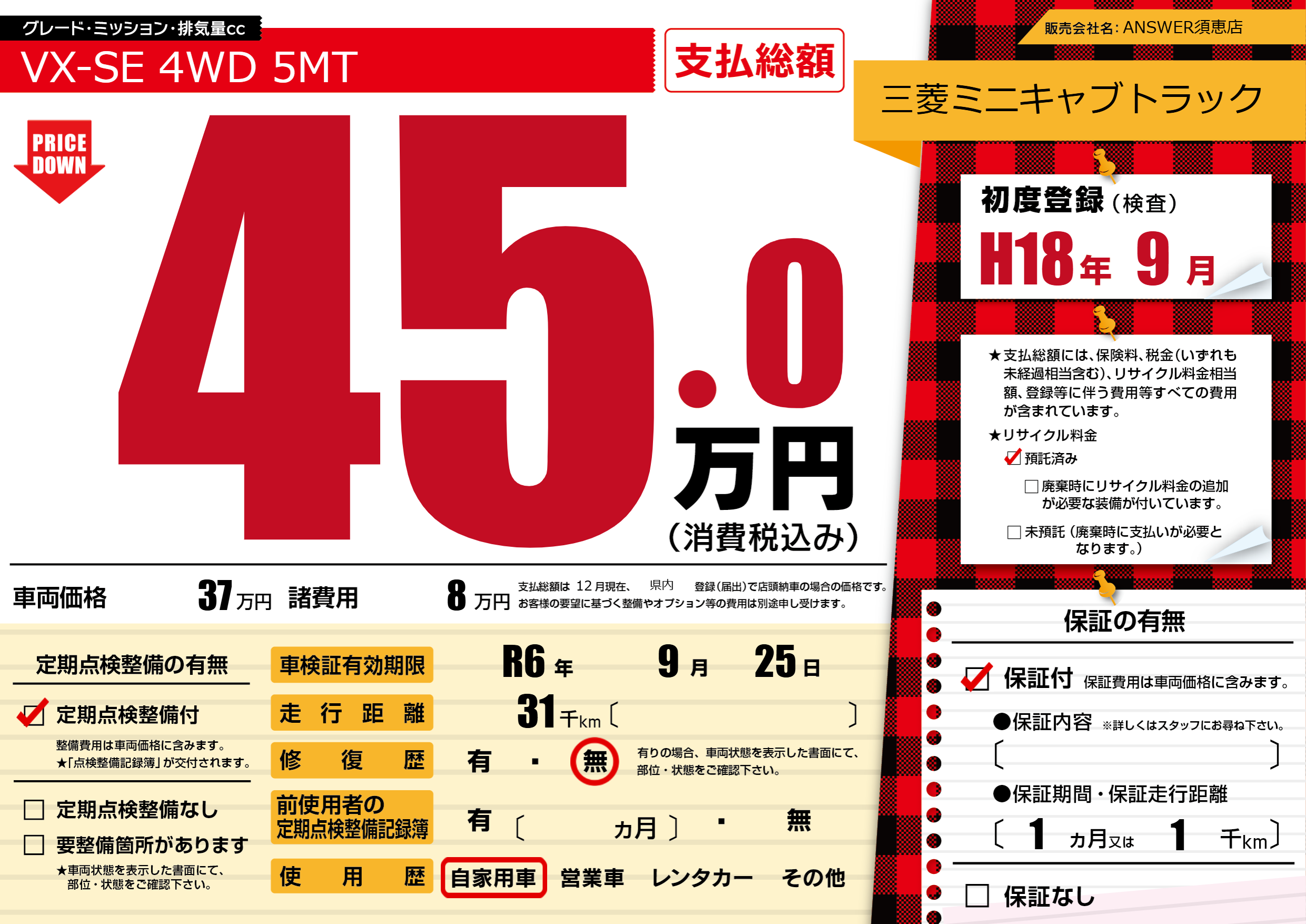 | 走行キロ | 3.1万km | 初年度登録 | H18年9月 |