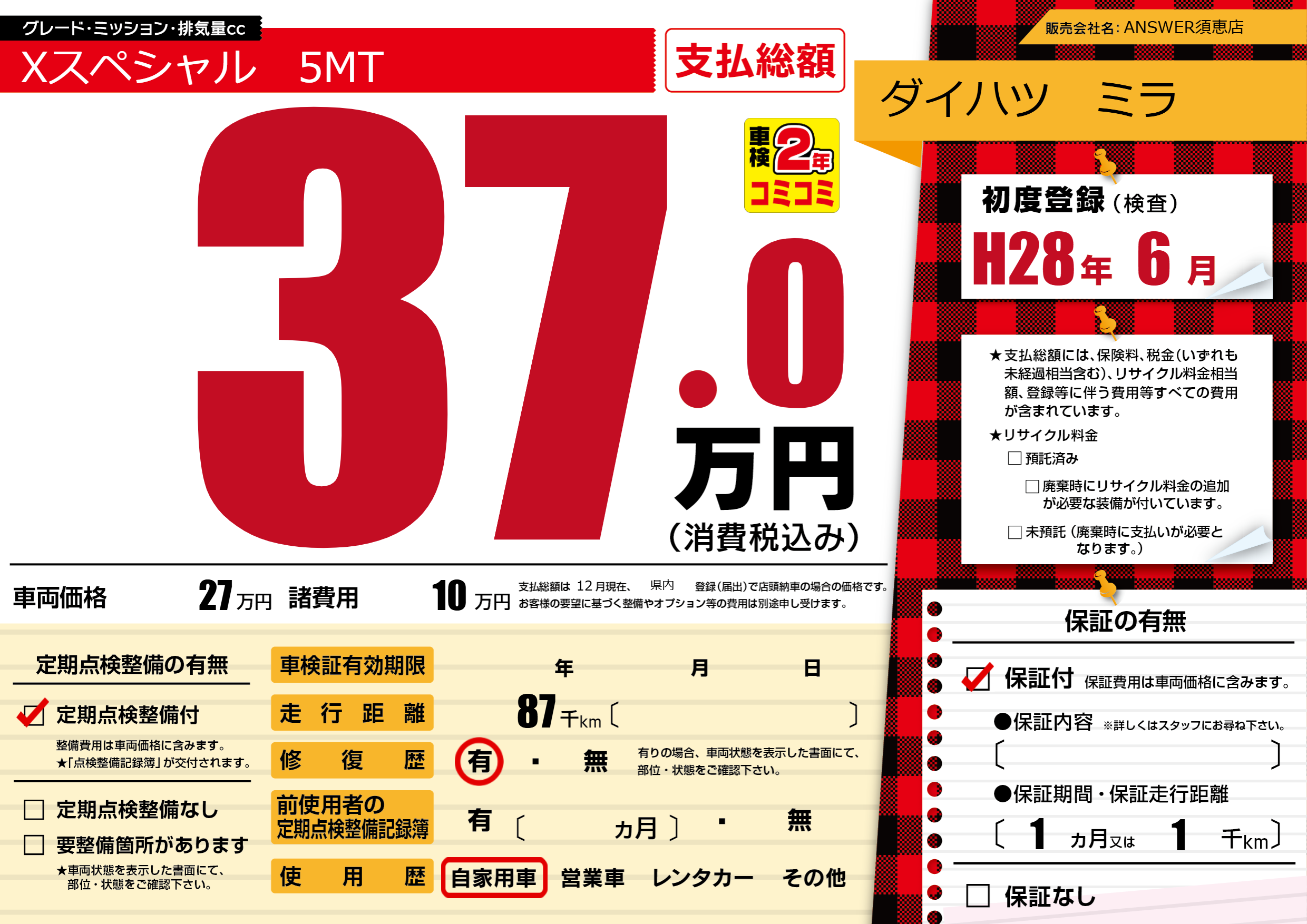 保証付き 保証内容(---) 1ヶ月または(1)千kmまで |