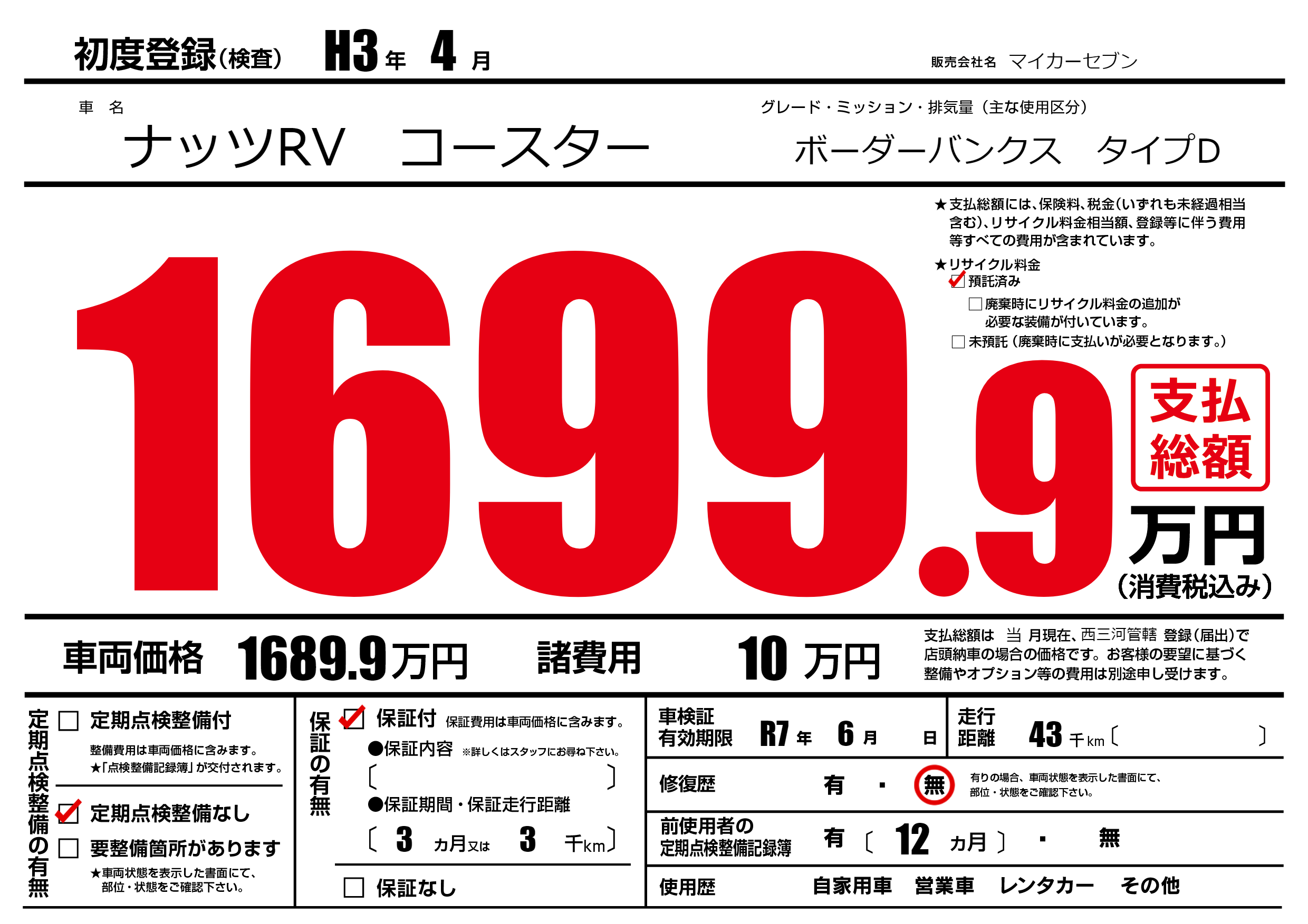 | 車名 | ナッツRV コースター | グレード ミッション 排気量 |