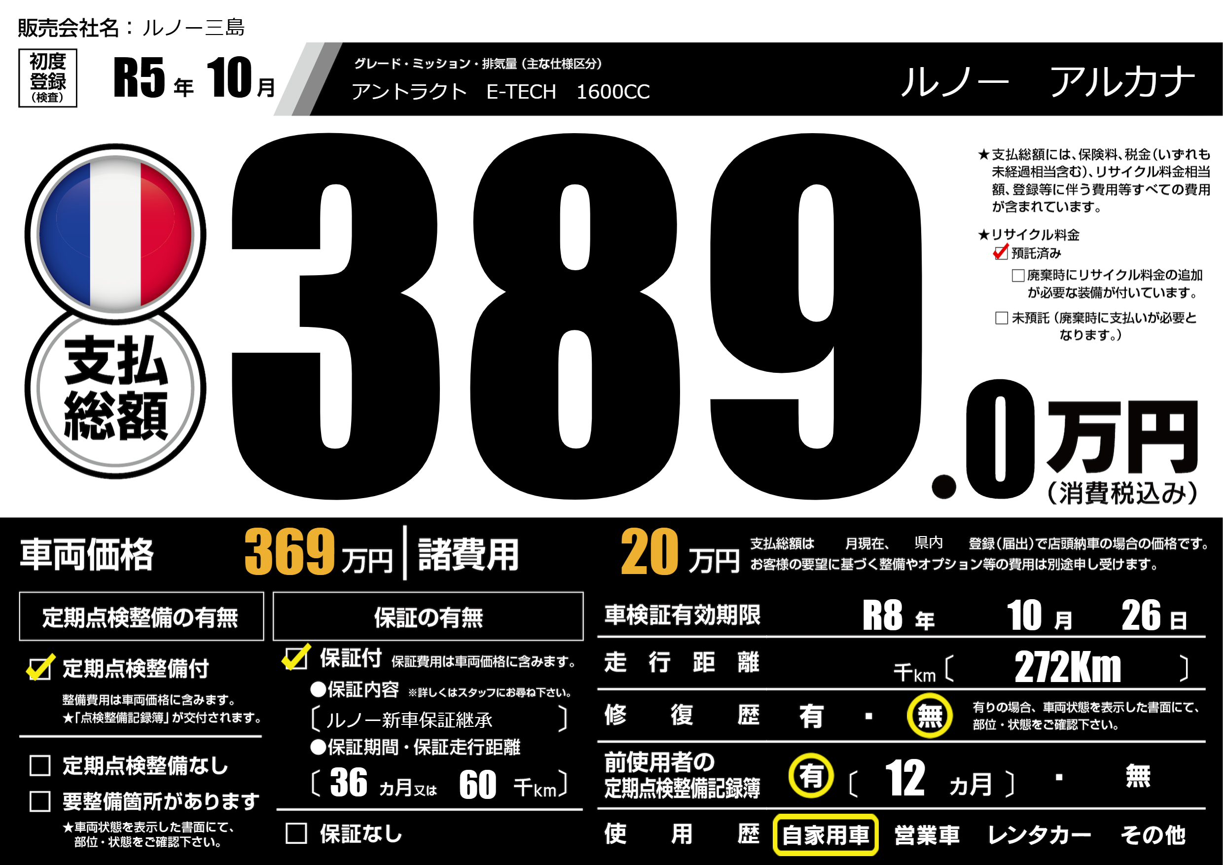 保証なし 保証内容(ルノー新車保証継承) 36ヶ月または(60)千kmまで |