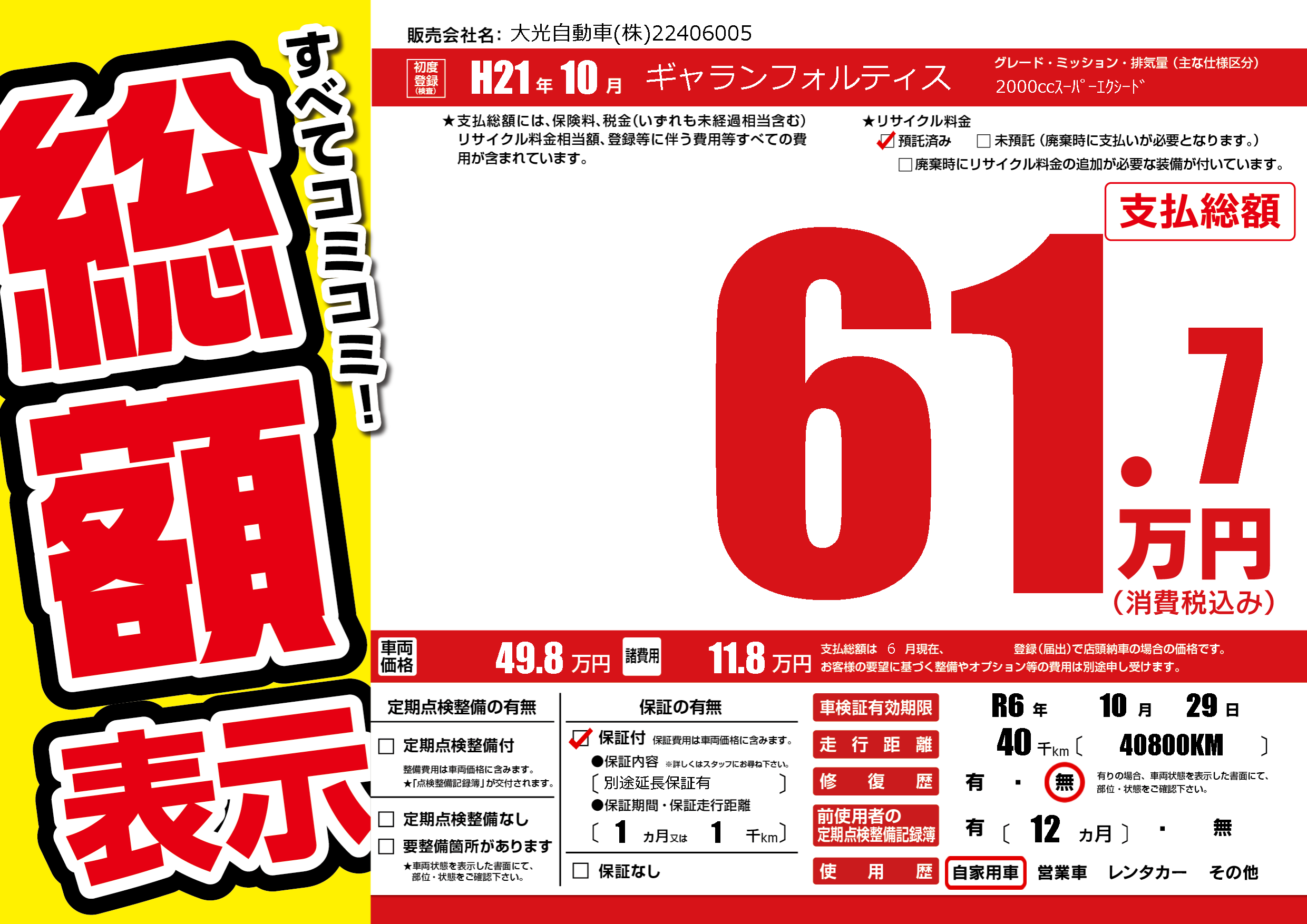 | 車検制限 | R6年 10月 29日 | ||