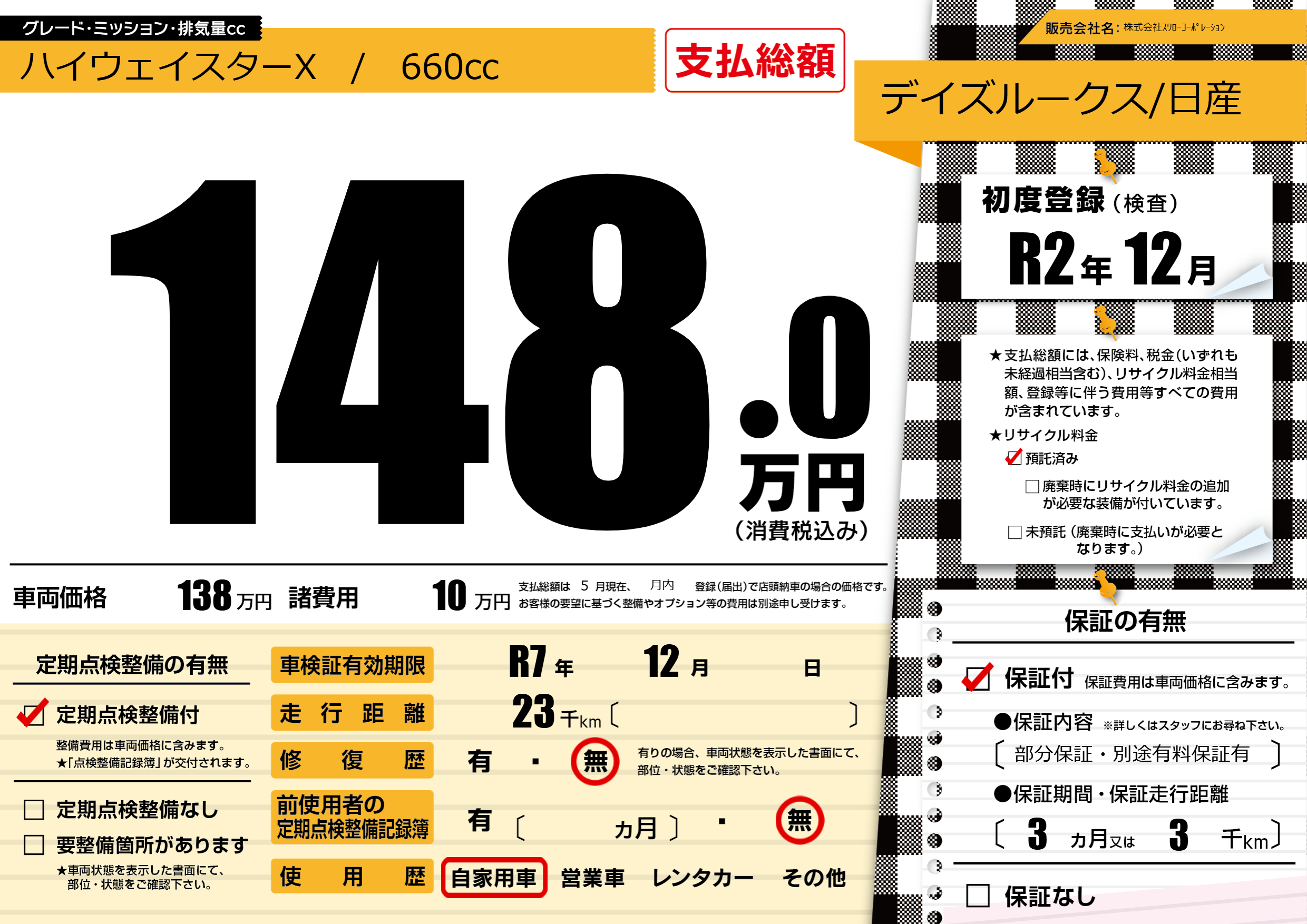 | 車検制限 | R7年 12月 - 日 | ||