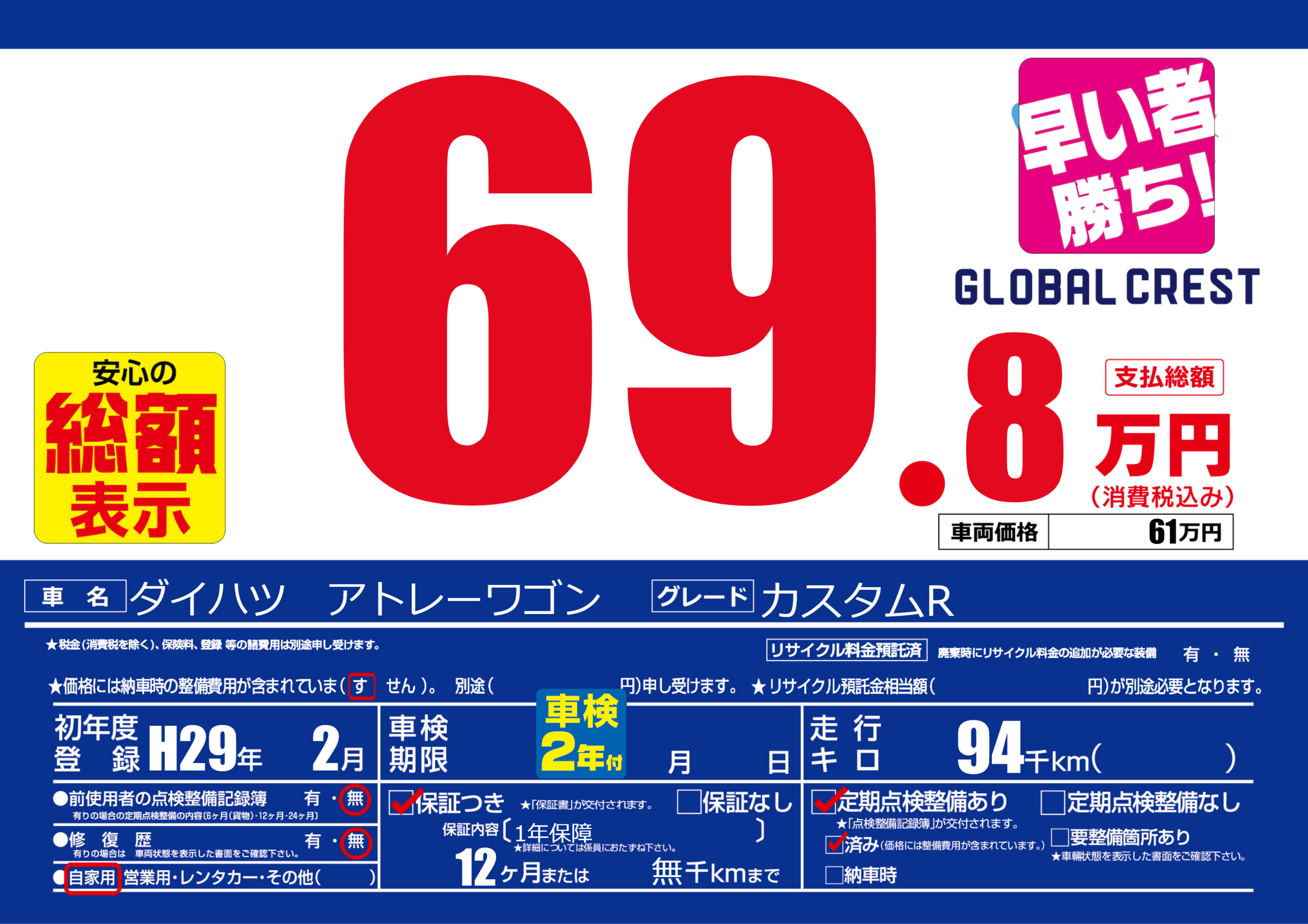 | 定期点検整備 | 定期点検整備あり 定期点検整備済み | ||
