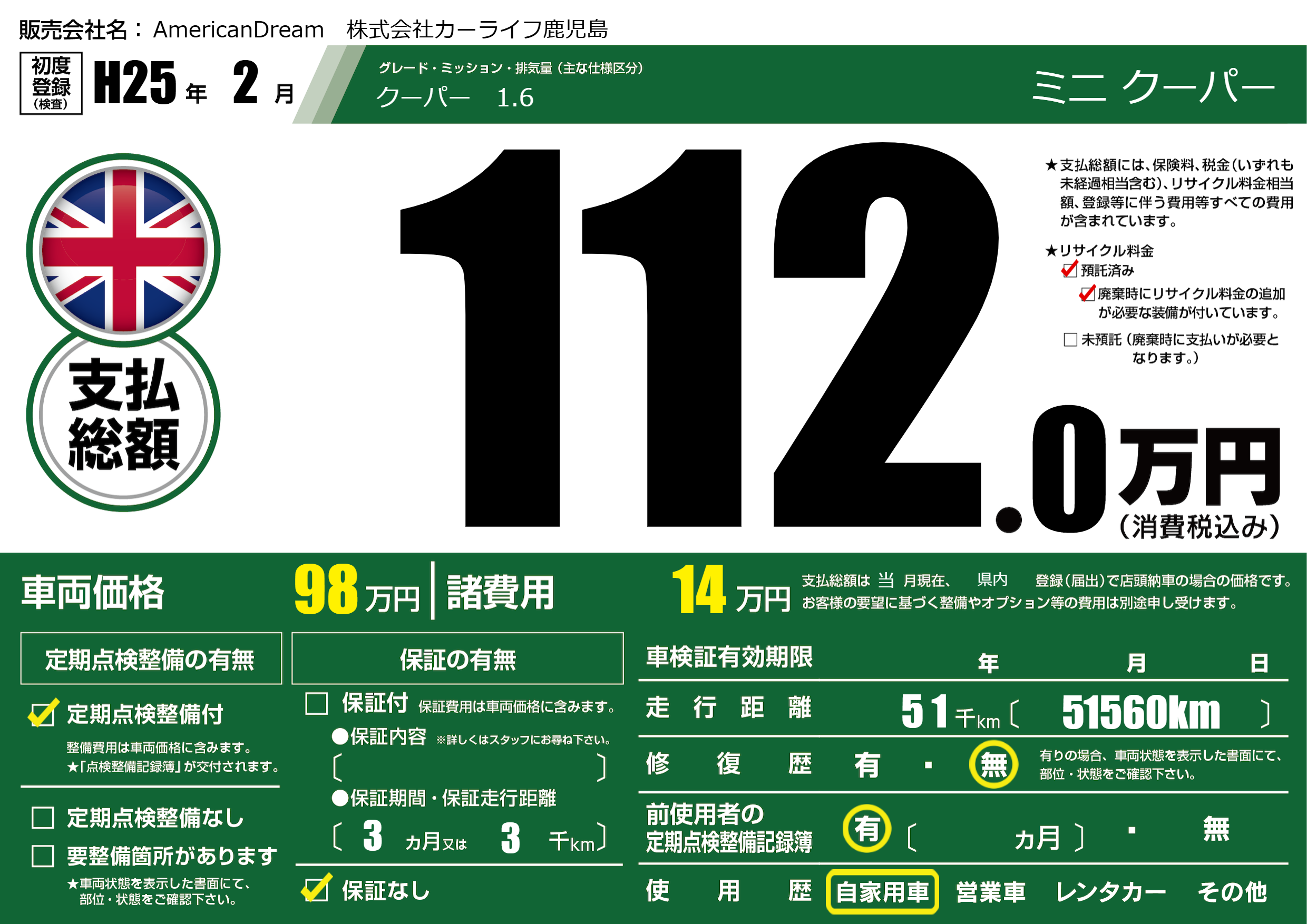 | 車名 | ミニ クーパー | グレード ミッション 排気量 |