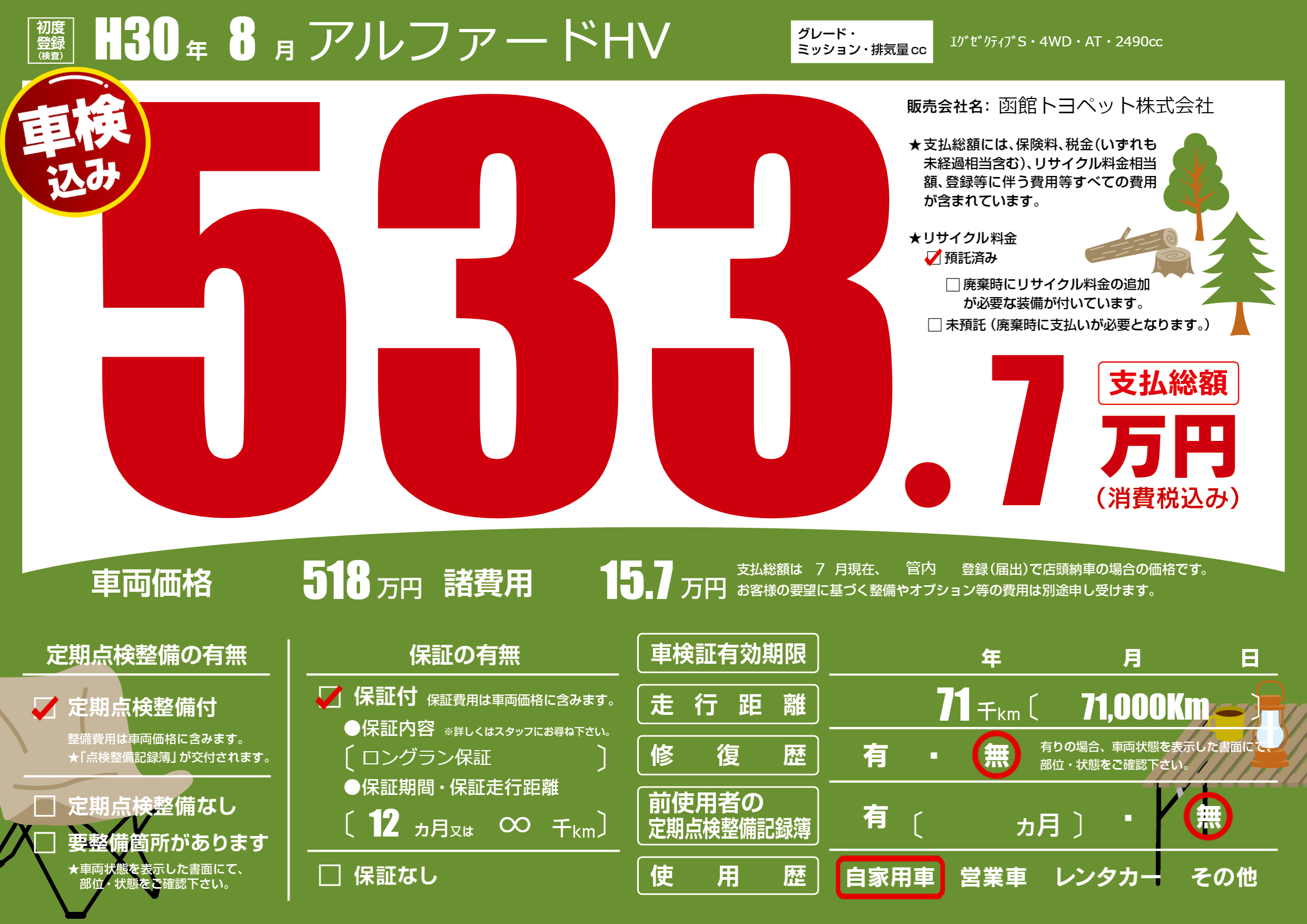 | 走行キロ | 7.1万km | 初年度登録 | H30年8月 |
