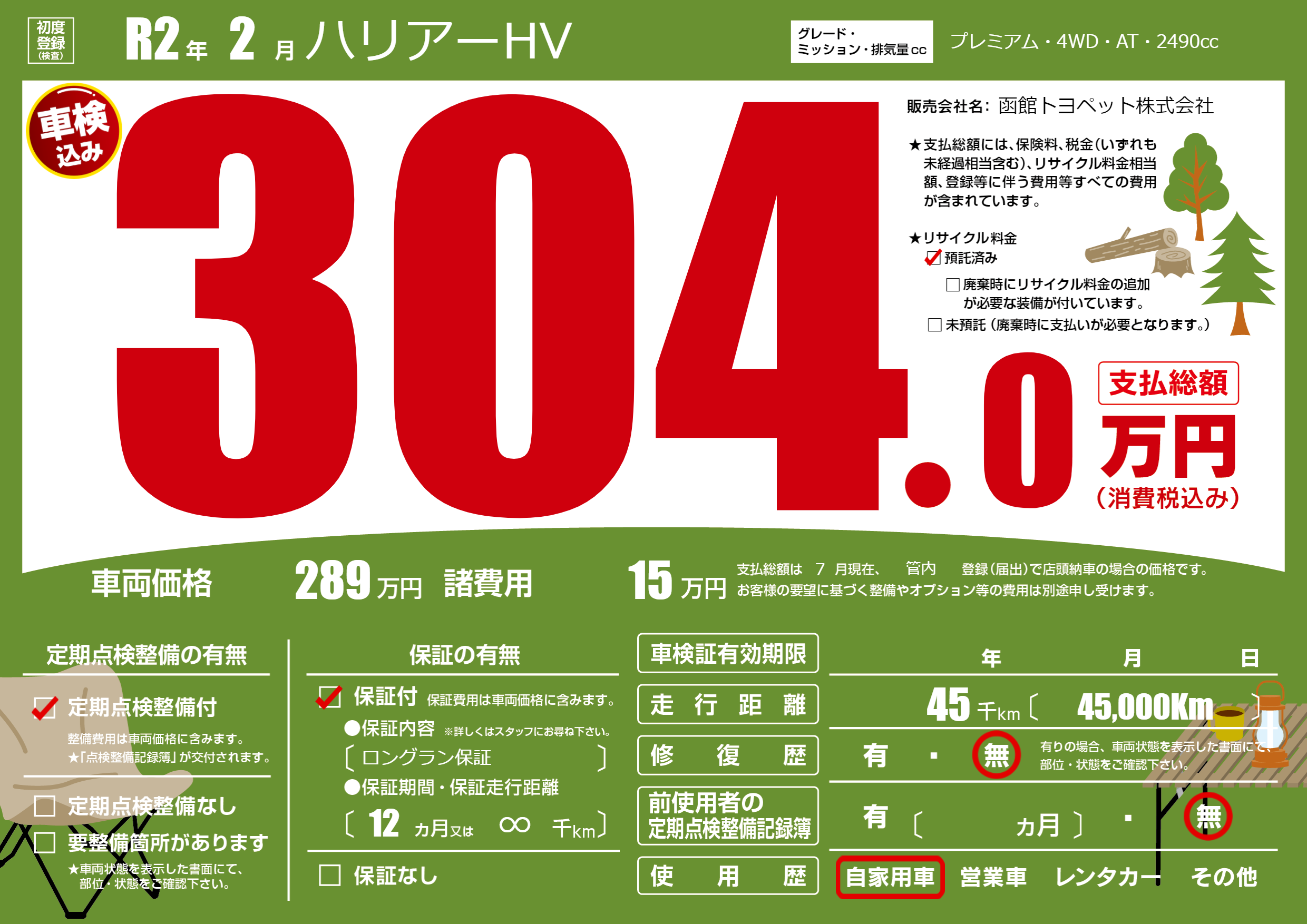 | 走行キロ | 4.5万km | 初年度登録 | R2年2月 |