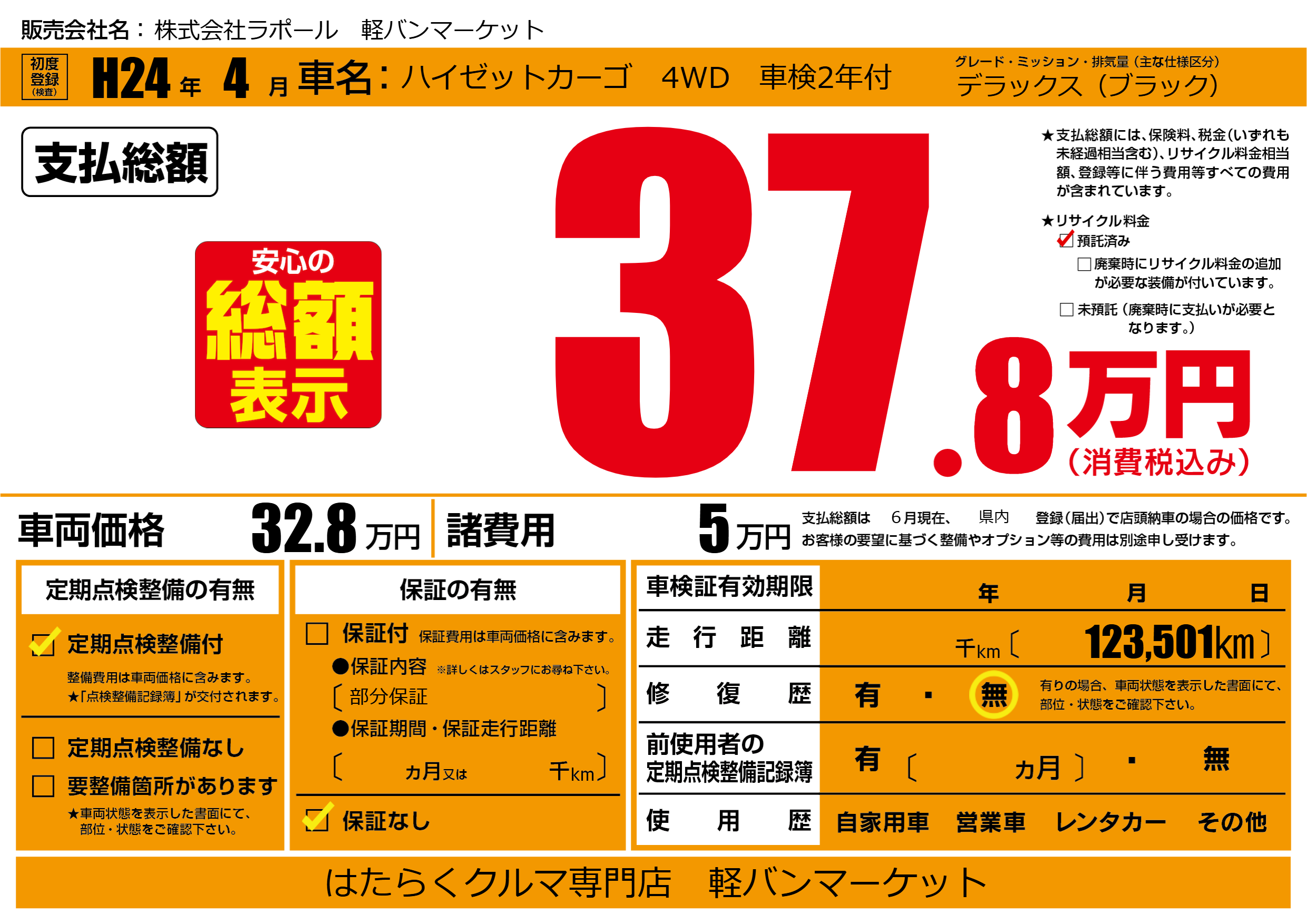 | 車名 | ハイゼットカーゴ 4WD 車検2年付 | グレード ミッション 排気量 |