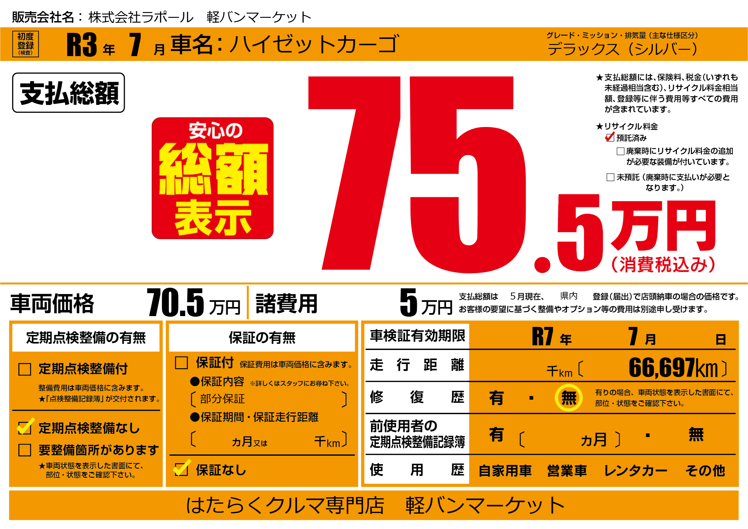 なし | 車検制限 | R7年7月---月 |